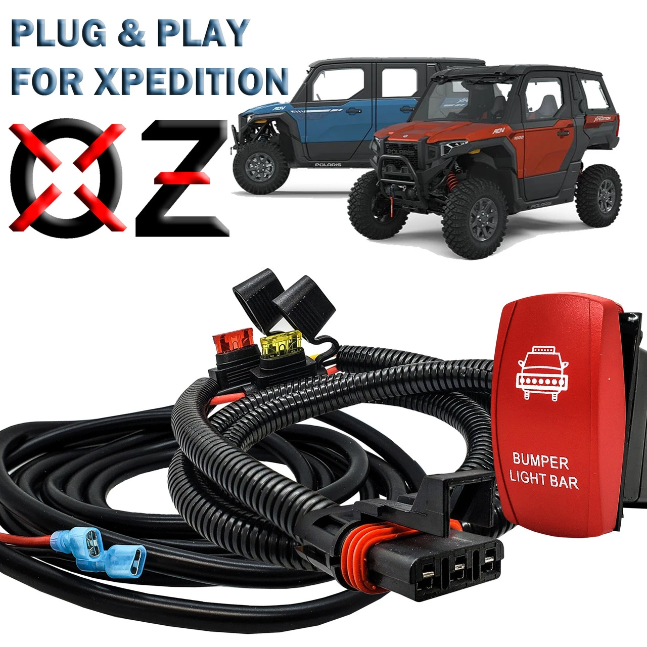 OZ-USA 10ft. Plug and Play Power Bus Bar Wire Kit with Laser-etched Bumper Light Bar On/Off Red Rocker Switch – the perfect synergy of convenience and functionality designed exclusively for your 2024 Polaris XPEDITION XP ADV Ultimate, Northstar, and Premium models. 10ft. AWG#14 Tin-Coated copper wire with silicon jacket and a 6ft. AWG #14 wire harness with pre-installed Pulse power bus bar plug integrated with our 4-Pin Bumper Light bar red rocker switch. The eye-catching laser-etched red cover plate will stand out on your rocker switch panel even in low-light conditions.