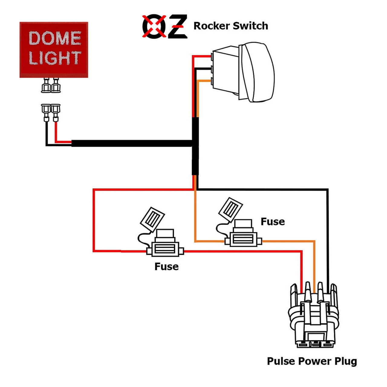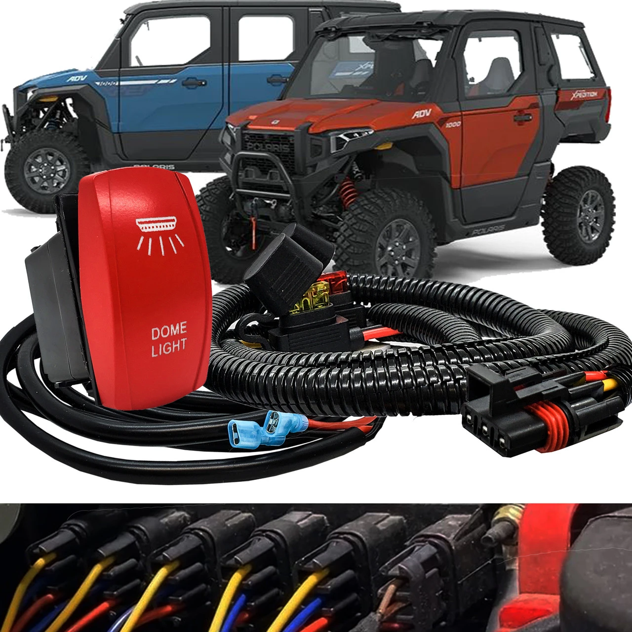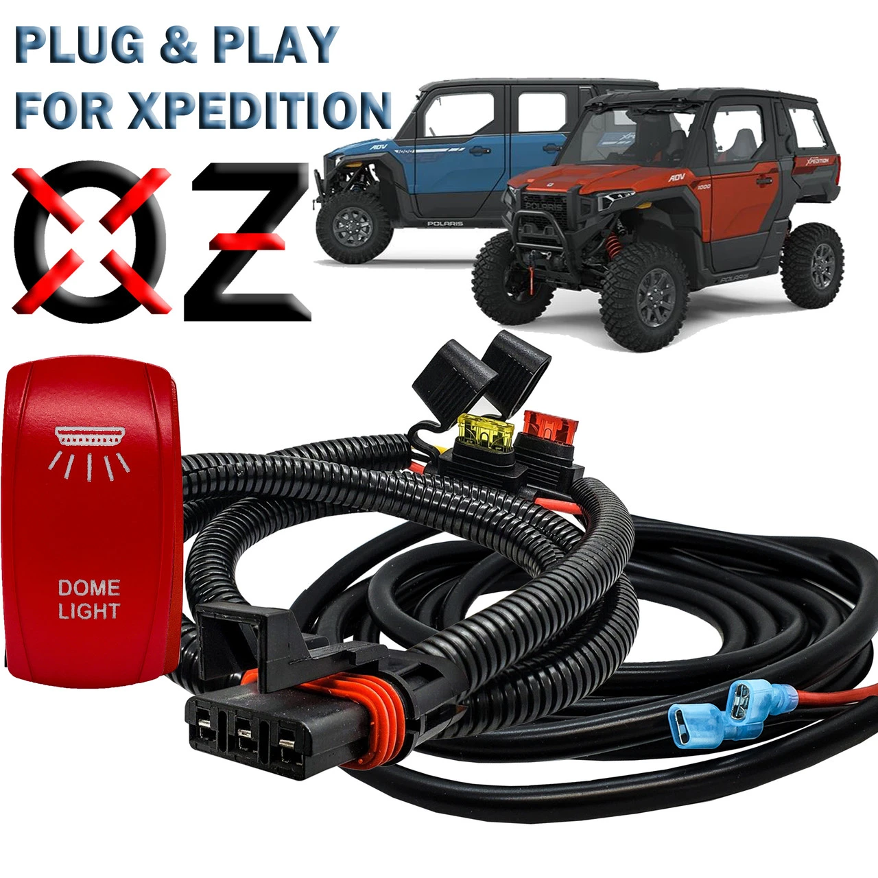 OZ-USA Plug and Play Pulse Power Bus Bar Wire Kit and Laser-etched DOME LIGHTS On/Off Red Rocker Switch – the perfect synergy of convenience and functionality designed exclusively for your 2024 Polaris XPEDITION XP ADV Ultimate, Northstar, and Premium models. 10ft. AWG#14 Tin-Coated copper wire with silicon jacket and a 6ft. AWG #14 wire harness with pre-installed Pulse power bus bar plug integrated with our 4-Pin Dome Lights red rocker switch. The eye-catching laser-etched red cover plate will stand out on your rocker switch panel even in low-light conditions.