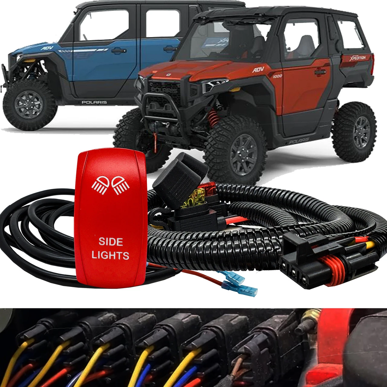 OZ-USA Plug and Play Pulse Power Bus Bar Wire Kit and Laser-etched SIDE LIGHTS On/Off Red Rocker Switch – the perfect synergy of convenience and functionality designed exclusively for your 2024 Polaris XPEDITION XP ADV Ultimate, Northstar, and Premium models. 10ft. AWG#14 Tin-Coated copper wire with silicon jacket and a 6ft. AWG #14 wire harness with pre-installed Pulse power bus bar plug integrated with our 4-Pin Side Lights red rocker switch. The eye-catching laser-etched red cover plate will stand out on your rocker switch panel even in low-light conditions.