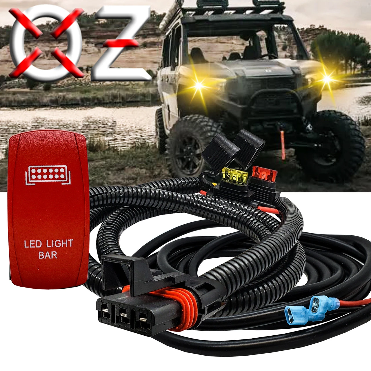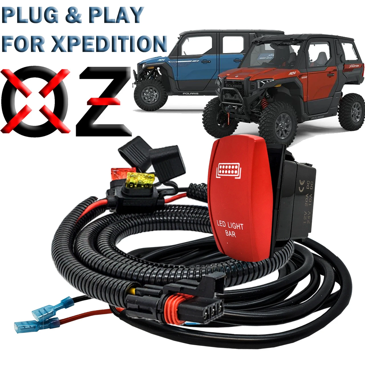 OZ-USA 10ft. Plug and Play Power Bus Bar Wire Kit with Laser-etched LED Light Bar On/Off Red Rocker Switch – the perfect synergy of convenience and functionality designed exclusively for your 2024 Polaris XPEDITION XP ADV Ultimate, Northstar, and Premium models. 10ft. AWG#14 Tin-Coated copper wire with silicon jacket and a 6ft. AWG #14 wire harness with pre-installed Pulse power bus bar plug integrated with our 4-Pin LED Light bar red rocker switch. The eye-catching laser-etched red cover plate will stand out on your rocker switch panel even in low-light conditions.