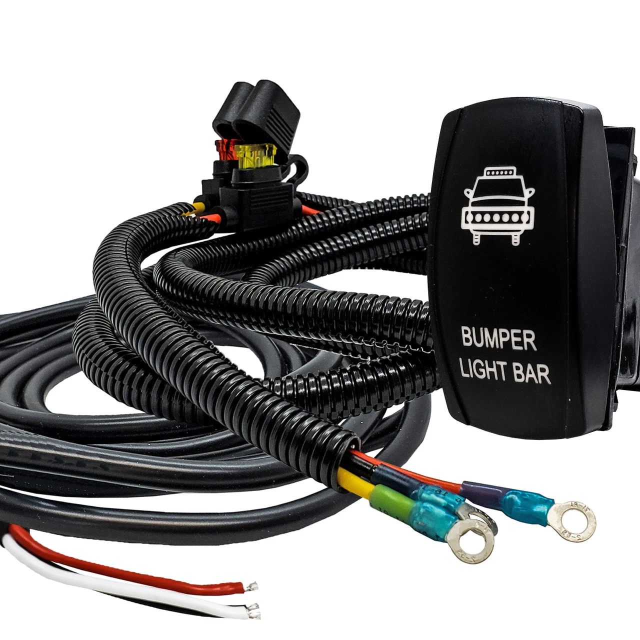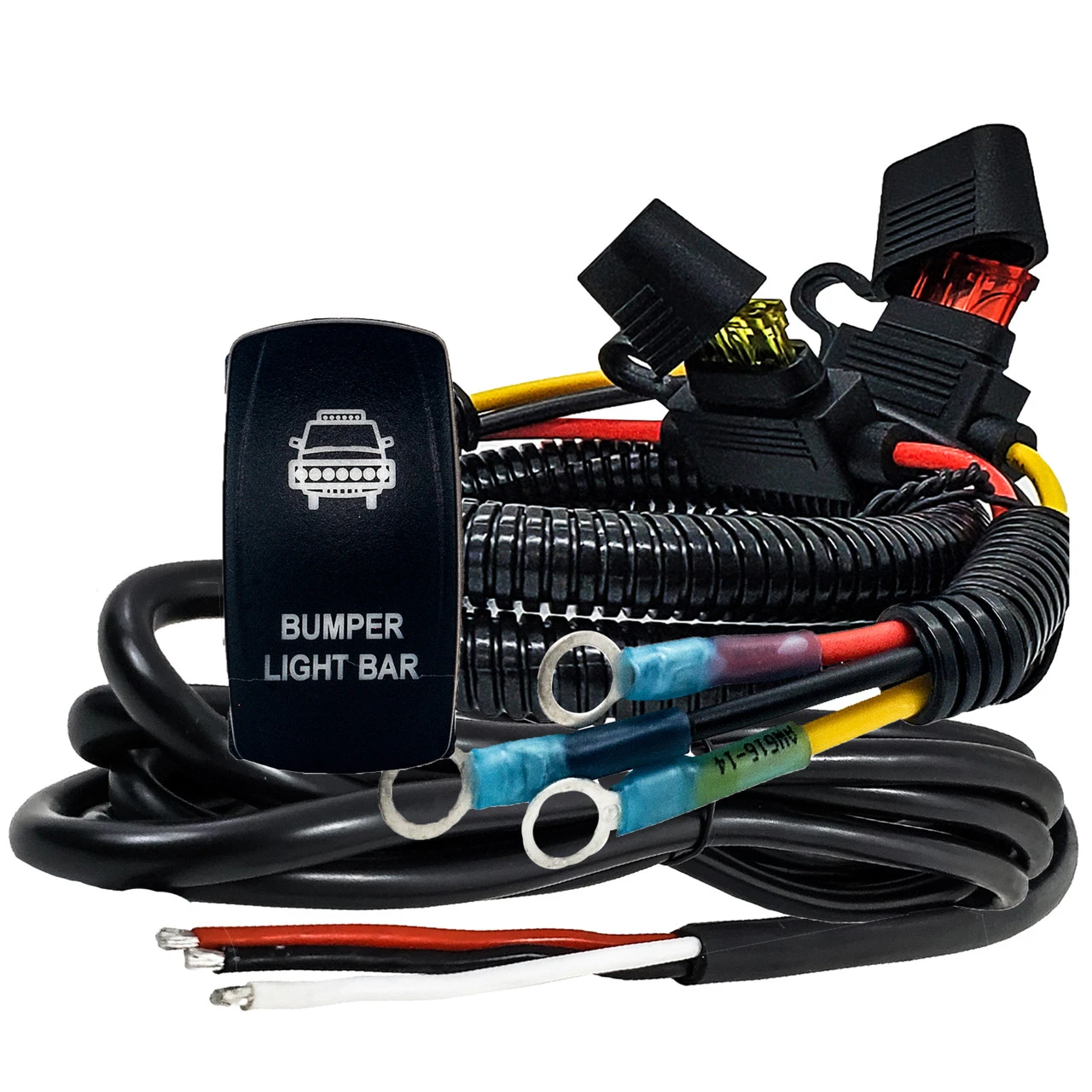 - Laser-etched BUMPER LIGHT BAR On/Off rocker switch with Blue LED backlit. 20 Amp 12-Volt 4-PIN.. Compatible with the in-dash or console rocker switch panel.