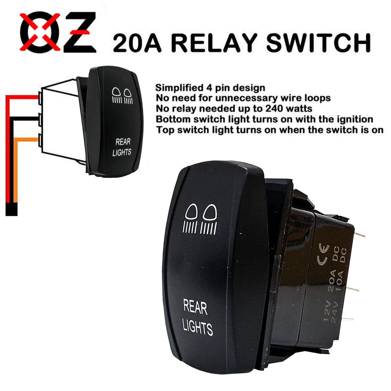 - Laser-etched REAR LIGHTS On/Off rocker switch with Blue LED backlit. 20 Amp 12-Volt 4-PIN.. Compatible with the in-dash or console rocker switch panel.