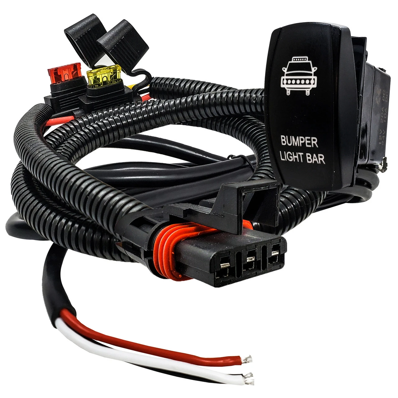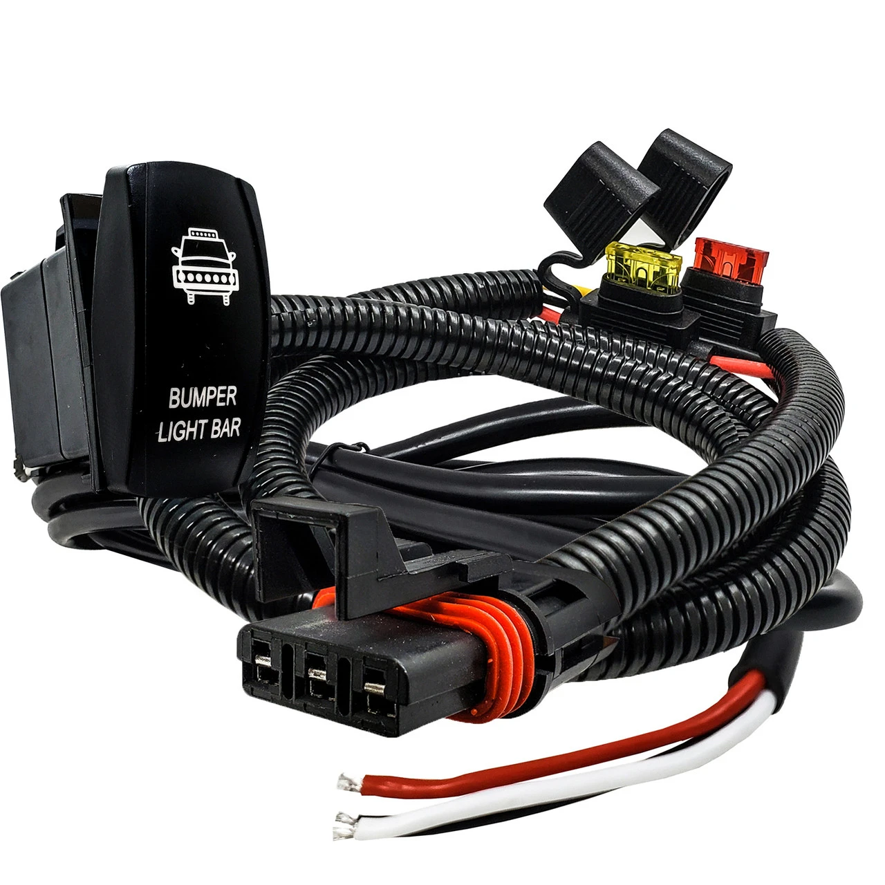 OZ-USA 10ft 3-Wire 14AWG with Plug and play power bus bar plug for dual function bumper lights compatible with 2018-2023 Polaris Ranger XP 1000 Pulse Plugs, RZR RS1/ Pro Pulse Plugs, 2019-2023 Polaris General 1000 Pulse Plugs and 2024 model Polaris XPEDITION XP Ultimate, ADV Ultimate, XP Northstar, ADV Northstar, XP Premium, and ADV Premium. Built-in fuse holders for both the ignition wire and constant power wire. This wire harness will work on any 3-wire LED lights. The black wire is ground, red wire is the positive wire, and the white wire is connected to the ignition or dash light. The bumper light harness comes with a 20A On/Off rocker switch which can handle up to 240 Watts of LED lights. This is the perfect wiring harness for your bumper lights with DRL functions or any secondary functions.