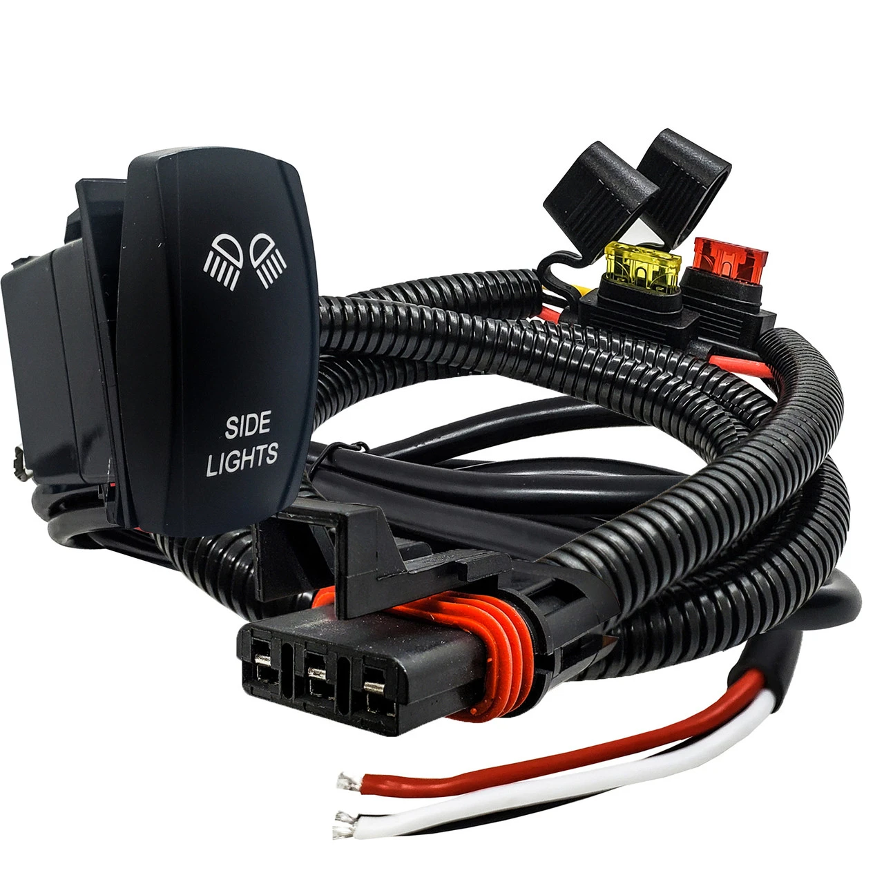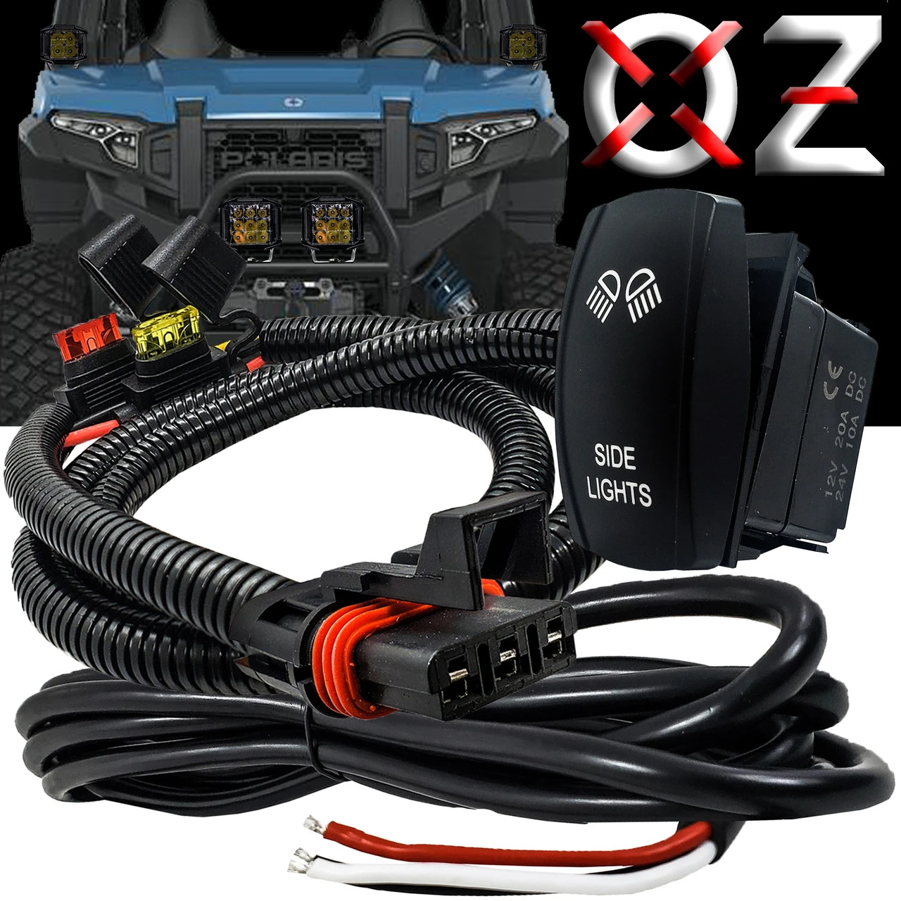 OZ-USA 10ft 3-Wire 14AWG with Plug and play power bus bar plug for dual function side lights compatible with 2018-2023 Polaris Ranger XP 1000 Pulse Plugs, RZR RS1/ Pro Pulse Plugs, 2019-2023 Polaris General 1000 Pulse Plugs and 2024 model Polaris XPEDITION XP Ultimate, ADV Ultimate, XP Northstar, ADV Northstar, XP Premium, and ADV Premium. Built-in fuse holders for both the ignition wire and constant power wire. This wire harness will work on any 3-wire LED lights. The black wire is ground, red wire is the positive wire, and the white wire is connected to the ignition or dash light. The side light harness comes with a 20A On/Off rocker switch which can handle up to 240 Watts of LED lights. This is the perfect wiring harness for your pillar lights, ditch lights, pod lights, side lights, or bumper lights with DRL functions or any secondary functions.