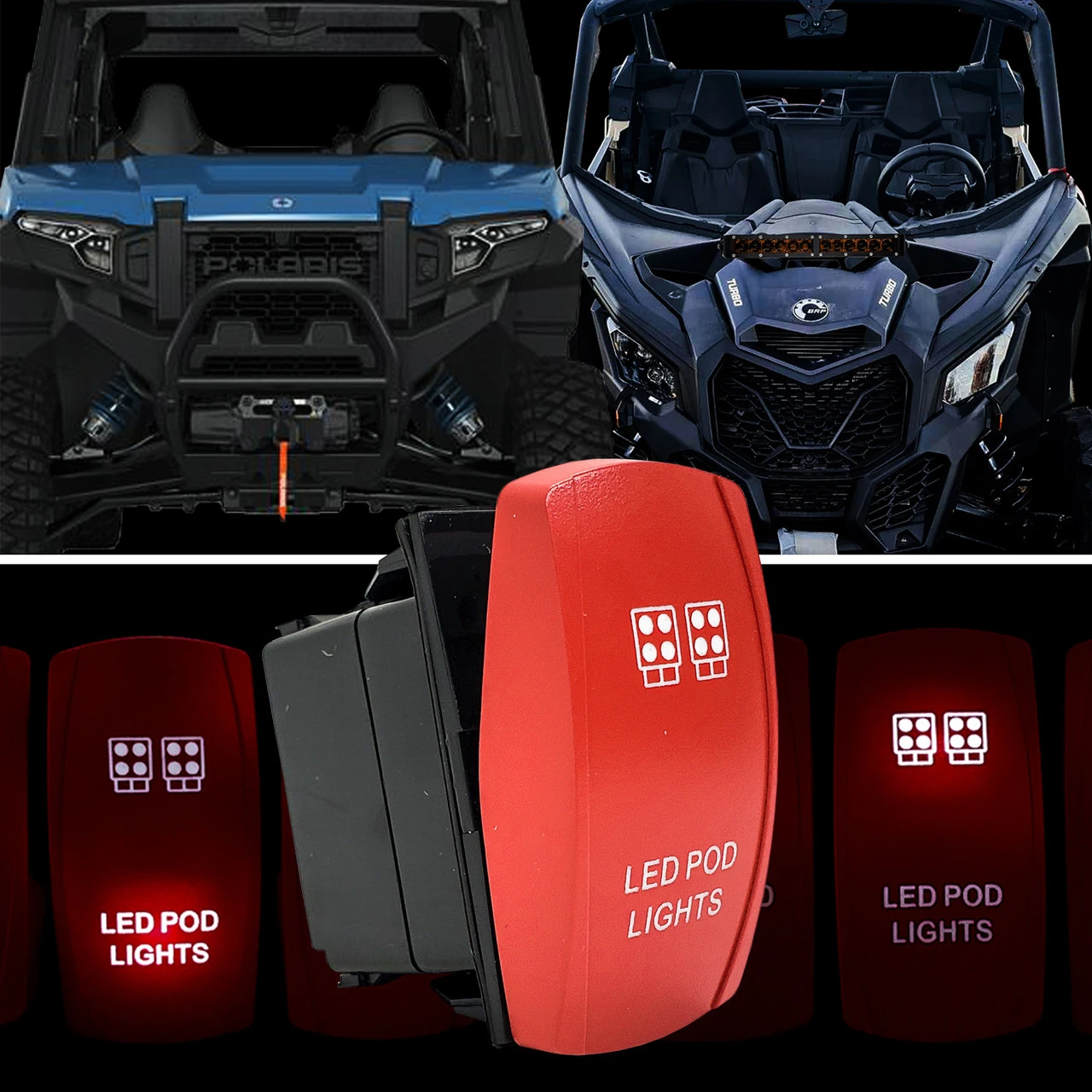 - On/Off LED Pod Light red rocker switch with white LED backlit. 20 Amp 12-Volt 4-PIN. Compatible with the Polaris rocker switch panel.
