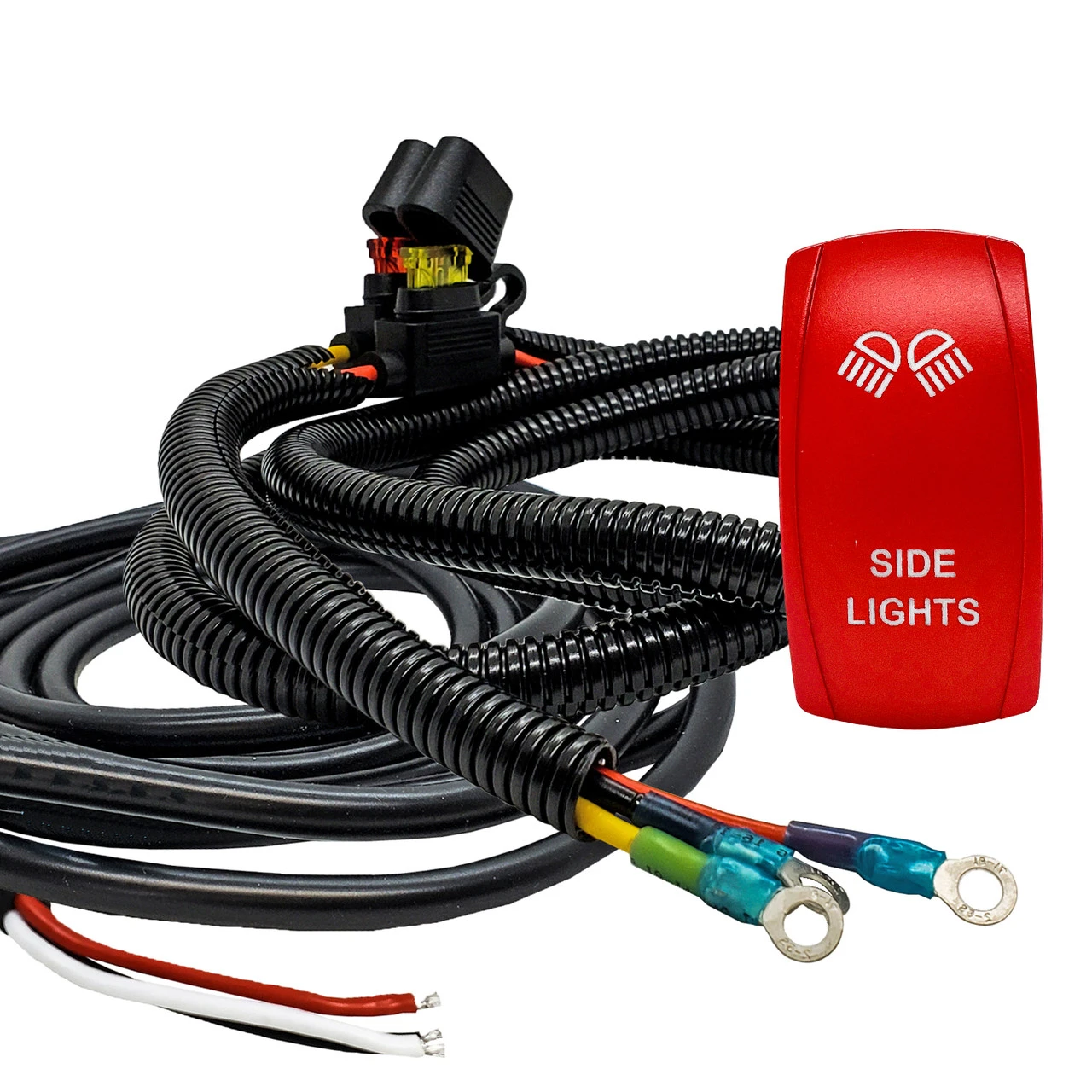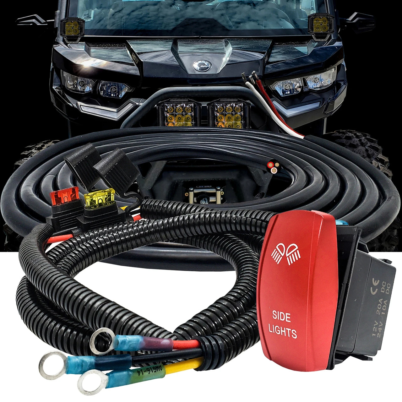 OZ-USA 10ft 3-Wire 14AWG Plug and play power busbar distribution block wire harness with On/Off red rocker switch for LED Side Lights compatible with Can-Am Maverick X3 Max RS Turbo RR, Sport, Trail, and Defender. 6ft. AWG #14 wire harness with pre-installed power distribution block terminal rings and On/Off rocker switch compatible with in-dash rocker switch panel. Built-in fuse holders for both the ignition wire and constant power wire. Also included, is a 10ft. silicon-coated 3-wire to power up side lights with DRL function or any secondary functions. This wire harness will work on any 3-wire LED light. The black wire is ground, the red wire is the positive wire, and the white wire is connected to the ignition or dash light. The lightbar harness comes with a 20A On/Off rocker switch which can handle up to 240 Watts of LED lights.