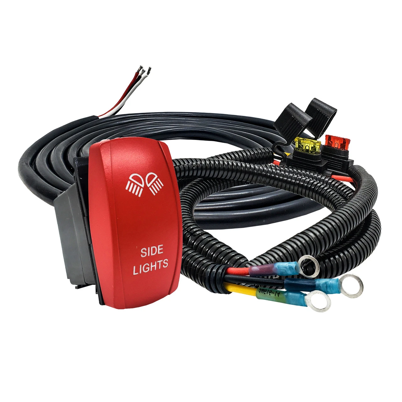 - 6ft. AWG#14 wire with a 10A fuse for ignition(key switch) and 20A fuse for constant power. Wires are protected with split wire loom tubing.