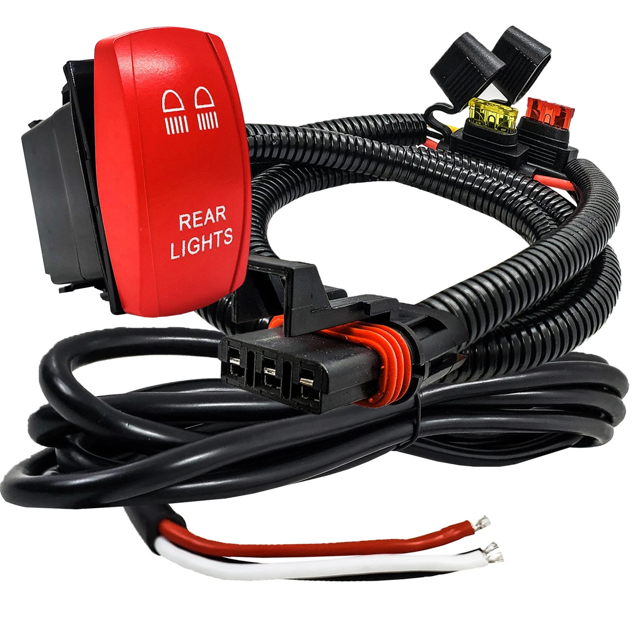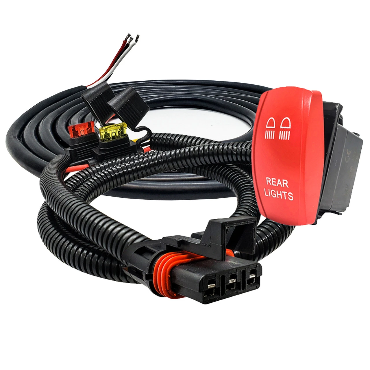 OZ-USA 10ft 3-Wire AWG#14 with Plug and play power bus bar plug for dual function rear lights compatible with 2018-2023 Polaris Ranger XP 1000 Pulse Plugs, RZR RS1/ Pro Pulse Plugs, 2019-2023 Polaris General 1000 Pulse Plugs and 2024 model Polaris XPEDITION XP Ultimate, ADV Ultimate, XP Northstar, ADV Northstar, XP Premium, and ADV Premium. Built-in fuse holders for both the ignition wire and constant power wire. This wire harness will work on any 3-wire LED lights. The black wire is ground, red wire is the positive wire, and the white wire is connected to the ignition or dash light. The rear light harness comes with a 20A On/Off red rocker switch which can handle up to 240 Watts of LED lights. This is the perfect wiring harness for your rear lights with DRL functions or any secondary functions.