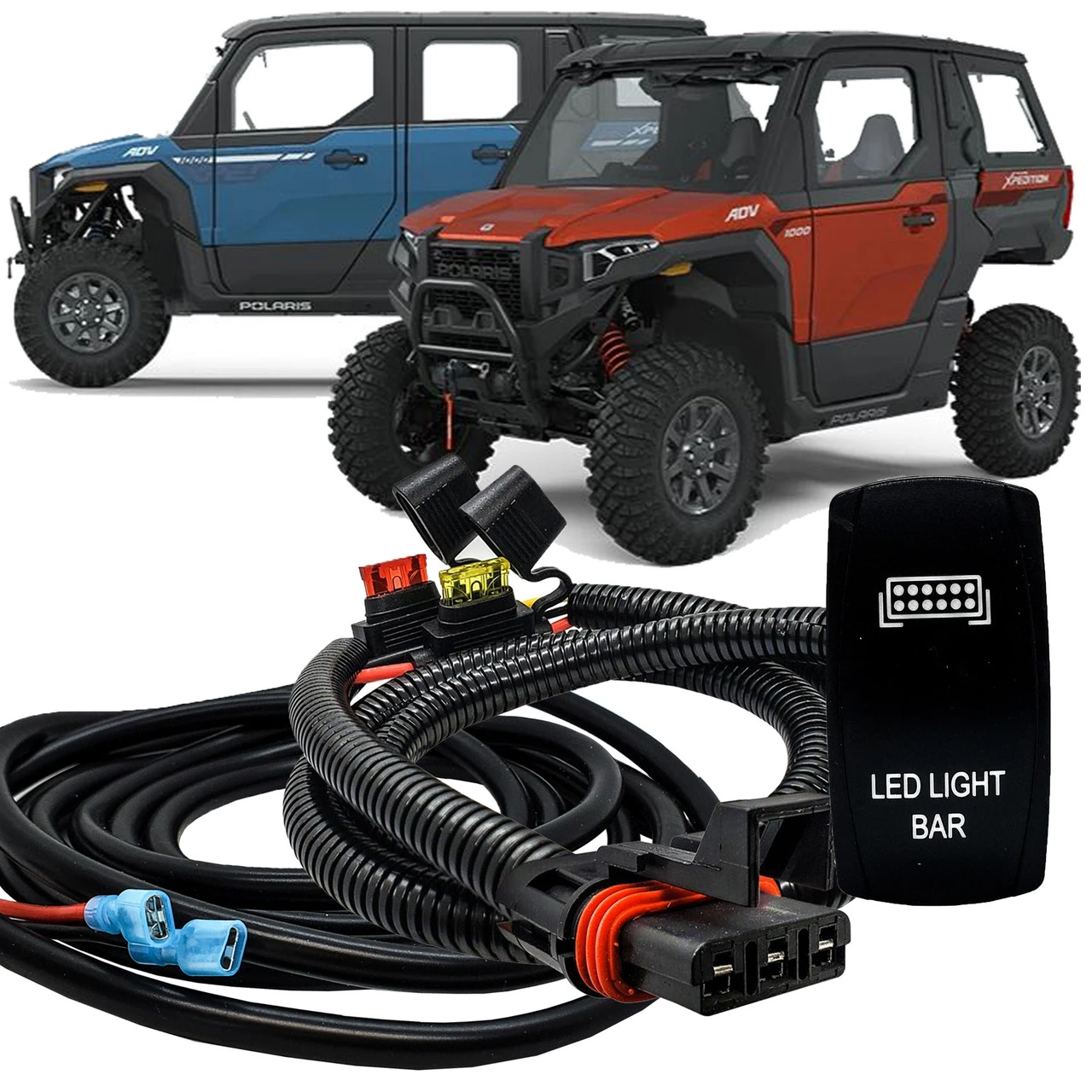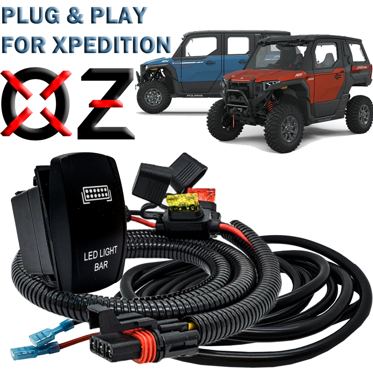 OZ-USA 10ft. Plug and Play Power Bus Bar Wire Kit with LED LIGHT BAR On/Off Rocker Switch – the perfect synergy of convenience and functionality designed exclusively for your 2024 Polaris XPEDITION XP ADV Ultimate, Northstar, and Premium models. 10ft. AWG#14 Tin-Coated copper wire with silicon jacket and a 6ft. AWG #14 wire harness with pre-installed Pulse power bus bar plug integrated with our 4-Pin LED Light Bar rocker switch.