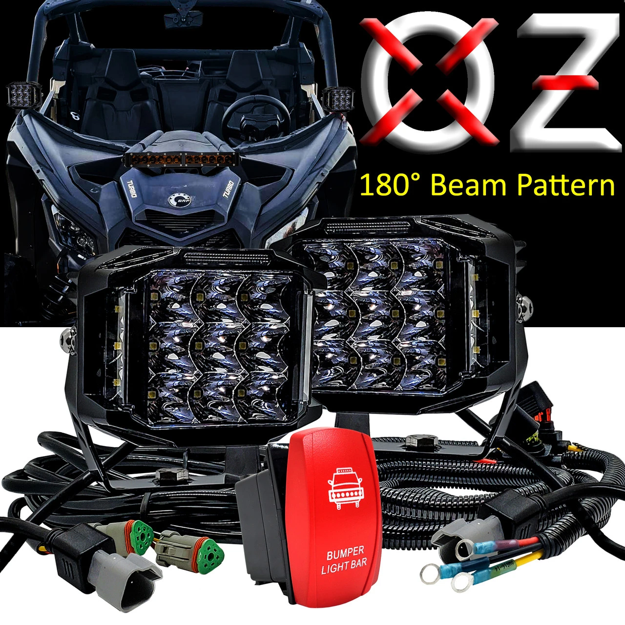 Introducing our 5″ Bumper Lights Side Emitting LED Pod Lights – the ultimate lighting solution for your UTV with Plug & Play power busbar wire harness kit compatible with 2018-2023 Can-Am Maverick X3 Max RS Turbo RR Sport Trail Defender . Unleash the power of illumination with a remarkable 180° Spot & Flood Beam Pattern, ensuring unparalleled visibility on every off-road adventure.