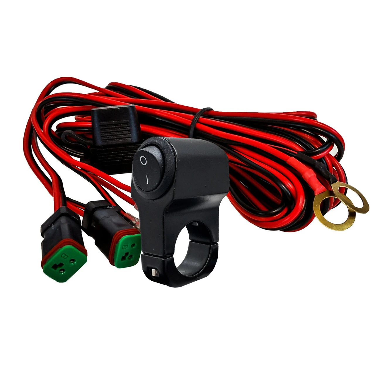 - 16 AWG wire, DT plug connectors with handlebar mount rocker switch and 30A fuse.