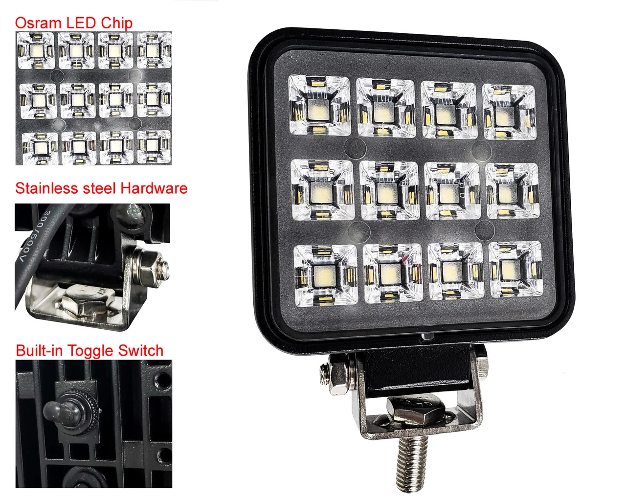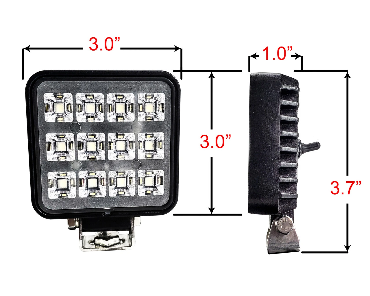 - 1 piece 3″ high output 12w LED square work light with built-in toggle switch.