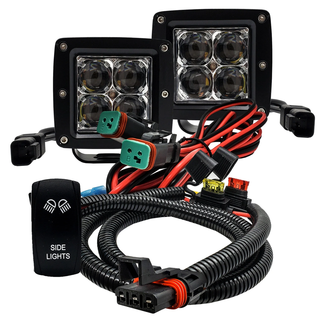 - 10 ft. split AWG #16 wire with a dual Deutsch plug and a 3.5 ft. AWG #14 wire with a 10A fuse for ignition (key switch) and 20A fuse for constant power, ensuring safe and reliable electrical connections. Enhanced wire protection using split wire loom tubing.