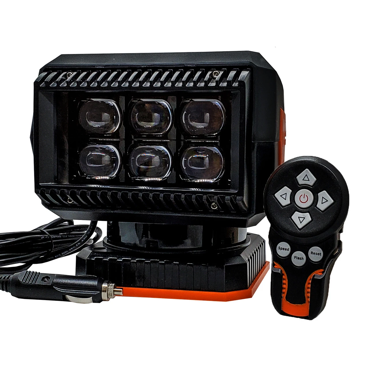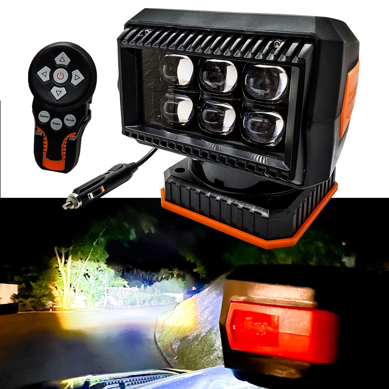 The 360° LED Searchlight Rotating Spotlight with Wireless Remote Control is a powerful lighting device that is designed for use in Fire trucks, rescue vehicles, utility trucks, boats, and RVs. The spotlight can rotate 360 degrees, providing illumination in any direction, and is controlled by a wireless remote control.