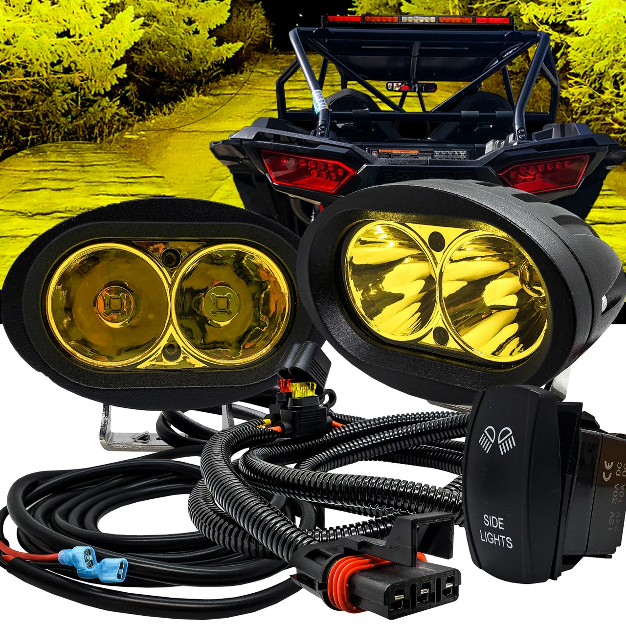 OZ-USA FR-Series 4″ Oval Fluorescent Yellow LED side lights with Plug & Play Pulse power busbar wire harness kit compatible with Pulse Power Bus Bar for 2018- 2023 Polaris Ranger XP 1000 Pulse Plugs, RZR RS1/ Pro Pulse Plugs, 2019-2023 Polaris General 1000 Pulse Plugs. The 4″ oval ditch lights offer exceptional brightness and a spot beam pattern, ensuring optimal illumination in various environments and weather conditions. This innovative kit comes complete with a power busbar wire harness, ensuring a seamless connection to your UTVs electrical system.