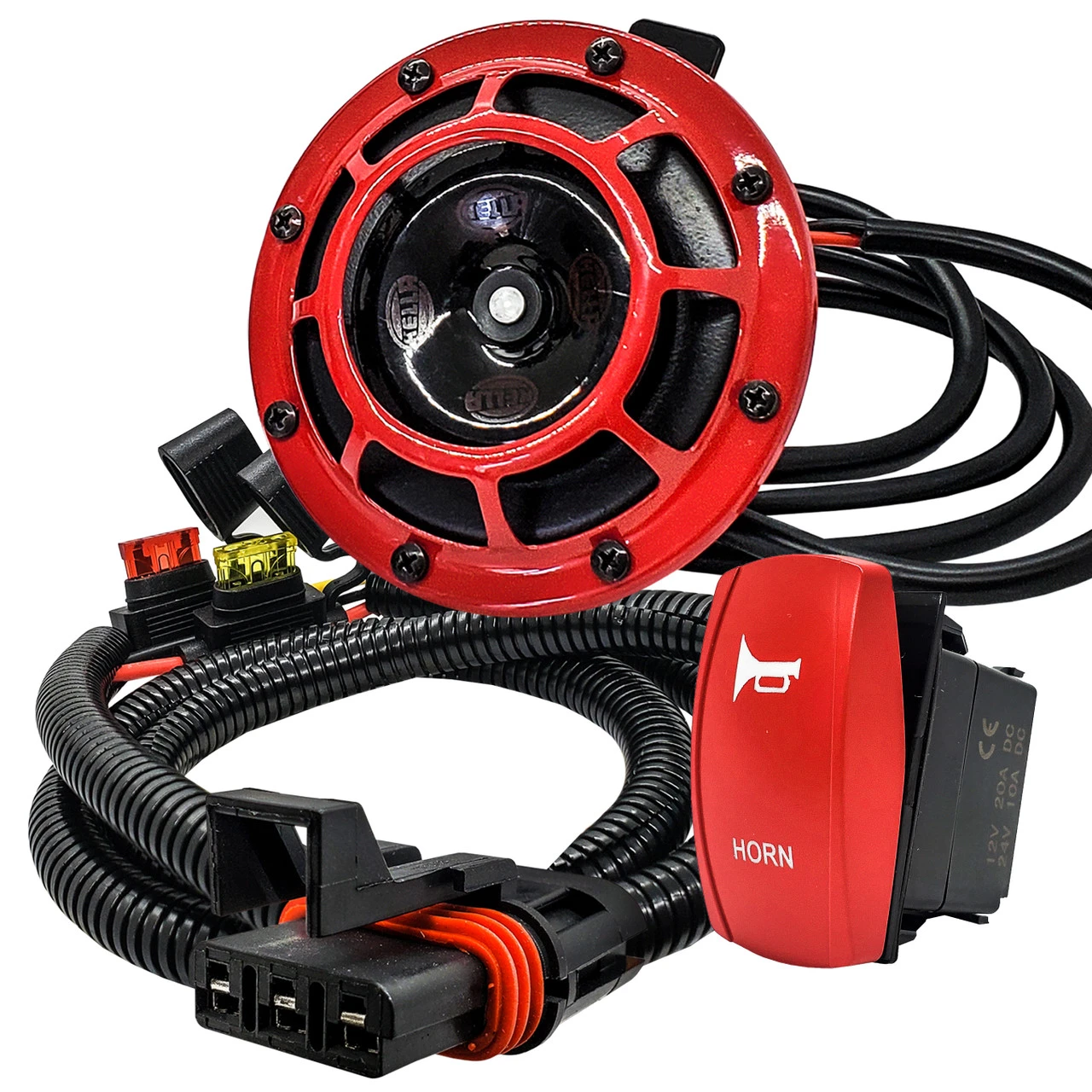 - Featuring a robust 14AWG wire setup, our kit guarantees durability and reliability. It includes a 10A fuse for ignition (key switch) and a 20A fuse for constant power, assuring safety and protection. The power wire is meticulously encased in split wire loom tubing, while the 5ft. horn wire is coated with silicon for easy routing and handling.