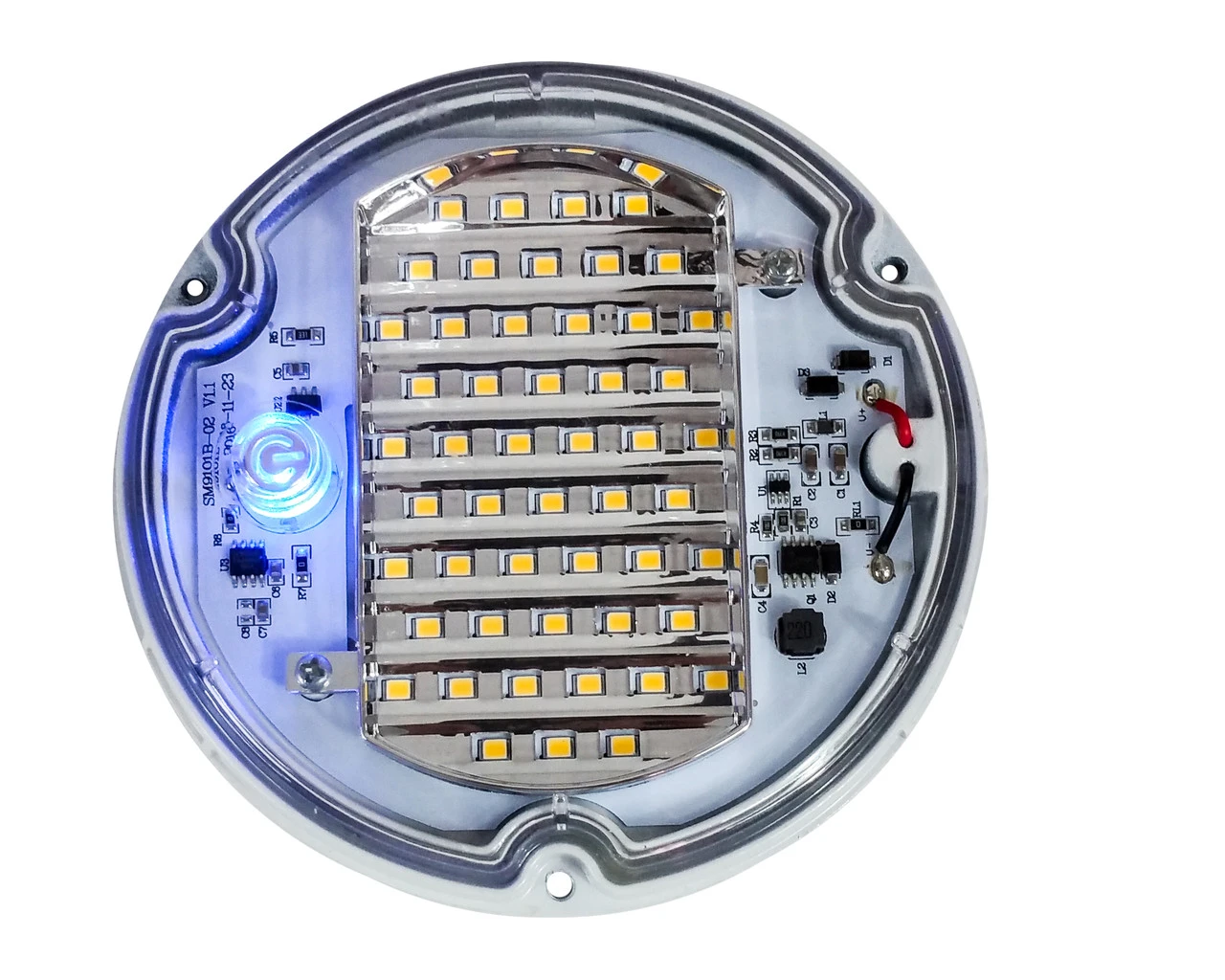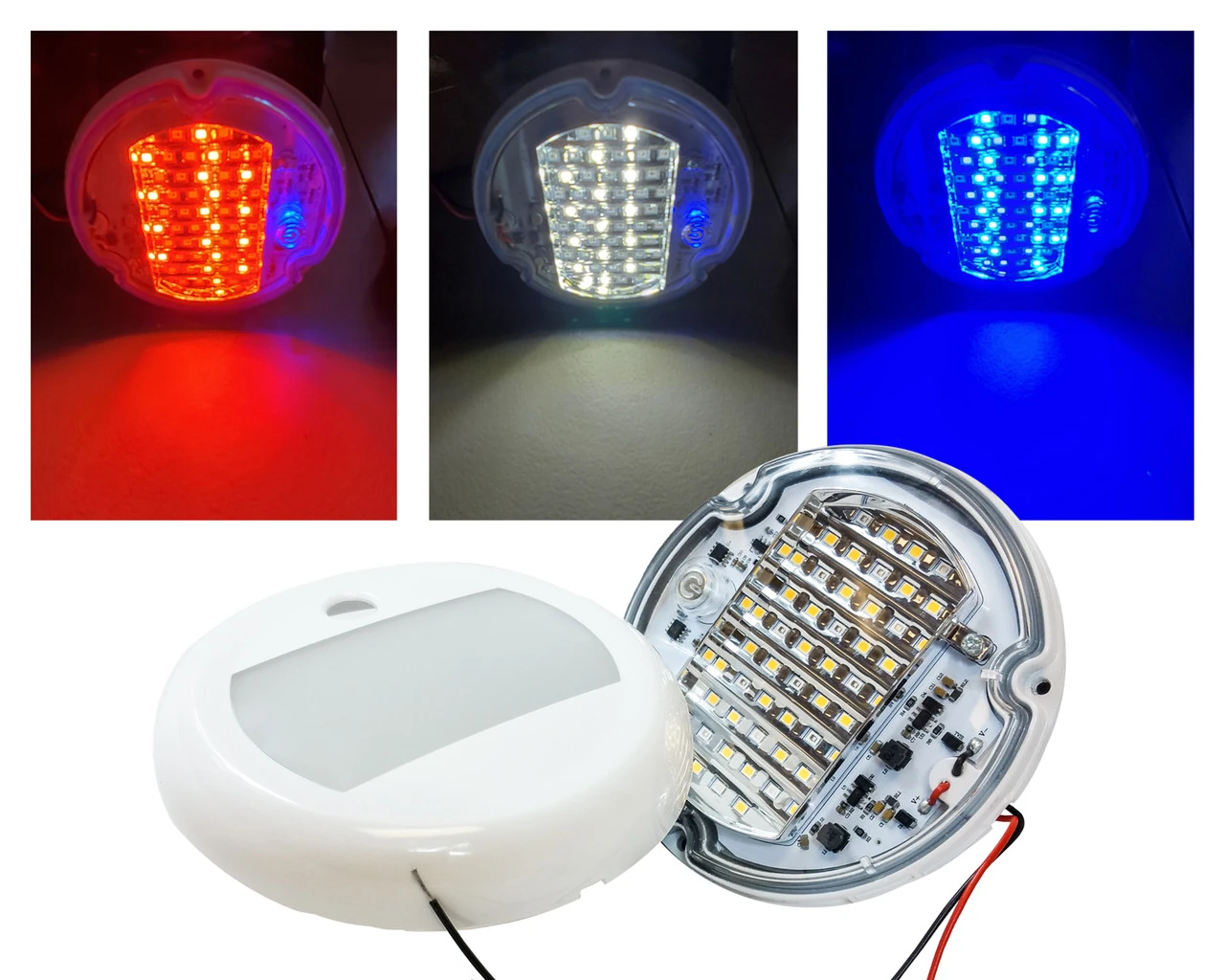 - OZ-USA® 5″ Round Dome Red White & Blue LED Light Interior Exterior Touch Sensor Switch light fixture with easy to locate blue back light. Dimmable
