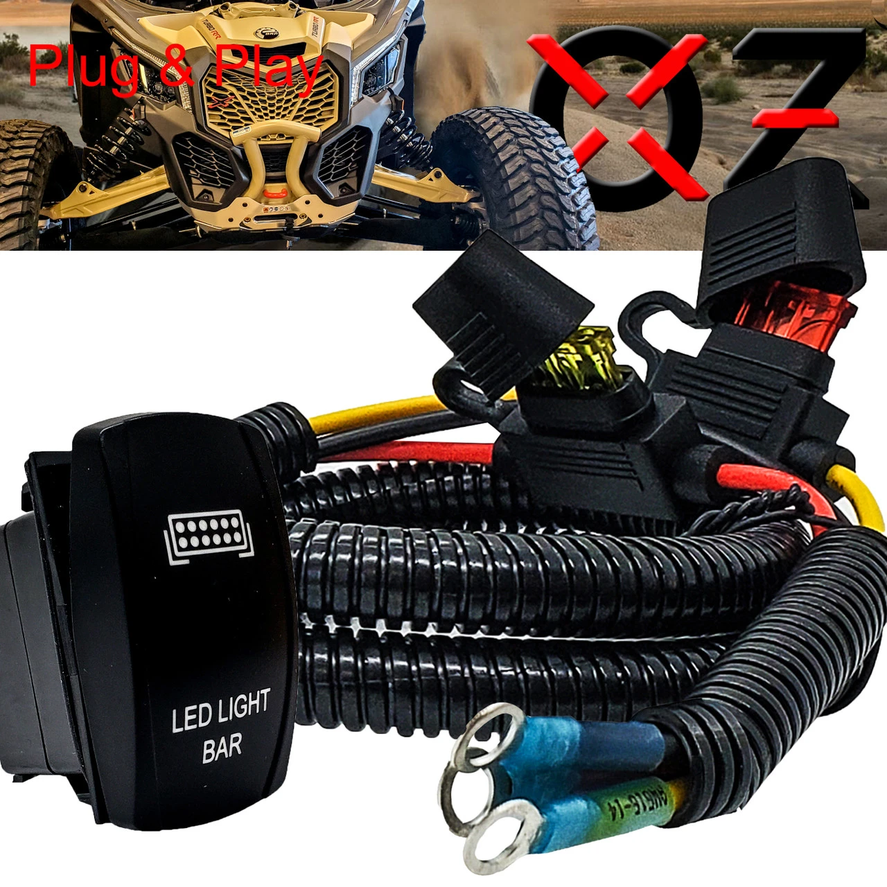 OZ-USA Plug and play power busbar distribution block wire harness with On/Off rocker switch for LED lightbar compatible with Can-Am Maverick X3 Max RS Turbo RR, Sport, Trail, and Defender. 6ft. AWG #14 wire harness with pre-installed power distribution block terminal rings and On/Off rocker switch compatible with in-dash rocker switch panel. Built-in fuse holders for both the ignition wire and constant power wire. This accessory wire harness will make it easier to add LED lights to your side-by-side. Simply plug in your LED lightbar power wire to the back of the rocker switch. The rocker switch relay can handle up to 240 Watt LED lights.