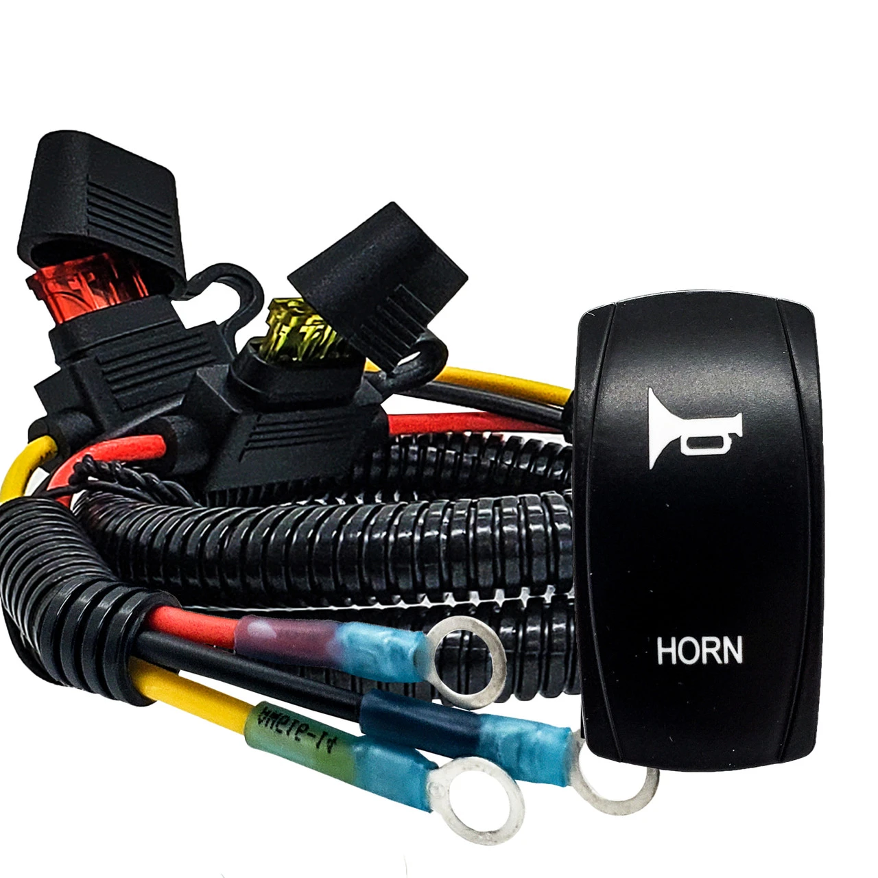 OZ-USA 6ft. Plug and play power busbar distribution block horn wire harness with momentary On/Off rocker switch for horn compatible with Can-Am Maverick X3 Max RS Turbo RR, Sport, Trail, and Defender. 6′ AWG#14 wire harness with pre-installed power distribution block terminal rings and momentary On/Off rocker switch compatible with in-dash rocker switch panel. Built-in fuse holders for both the ignition wire and constant power wire. This accessory wire harness will make it easier to add a horn. Simply plug in the horn wire to the back of the rocker switch. The wire harness is compatible with most off-road traffic blasters in the market. It can handle up to 240W.