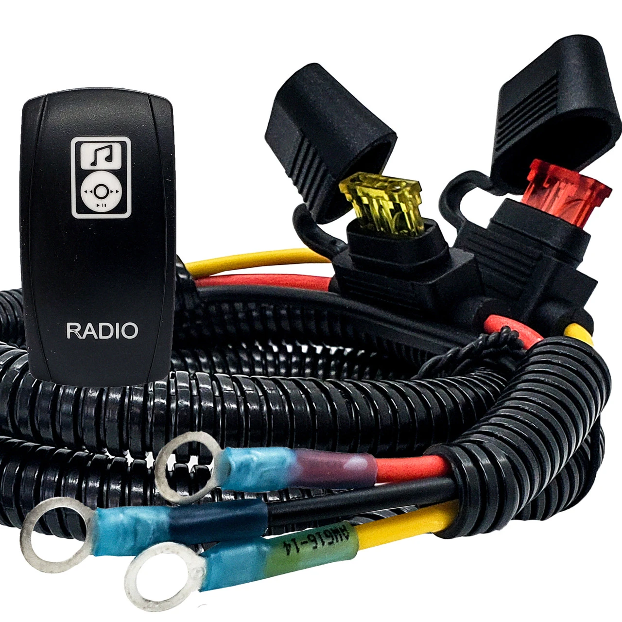 - RADIO On/Off rocker switch included. Blue LED backlit. 20 Amp 12-Volt 4-PIN SPST Rocker Switch.
