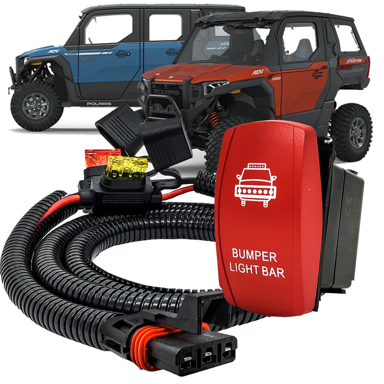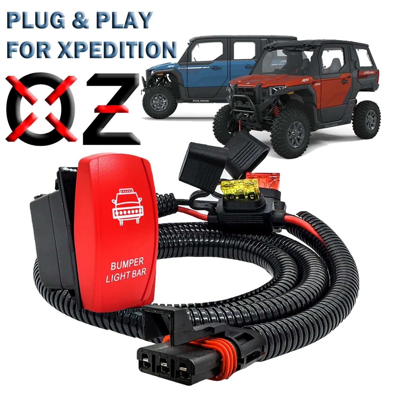 OZ-USA Plug and Play Power Bus Bar Wire Kit with Laser-etched BUMPER LIGHT BAR On/Off Red Rocker Switch – the perfect synergy of convenience and functionality designed exclusively for your 2024 Polaris XPEDITION XP ADV Ultimate, Northstar, and Premium models. 6ft. AWG #14 wire harness with pre-installed Pulse power bus bar plug integrated with our 4-Pin Bumper Light Bar red rocker switch. The eye-catching laser-etched red cover plate will stand out on your rocker switch panel even in low-light conditions.
