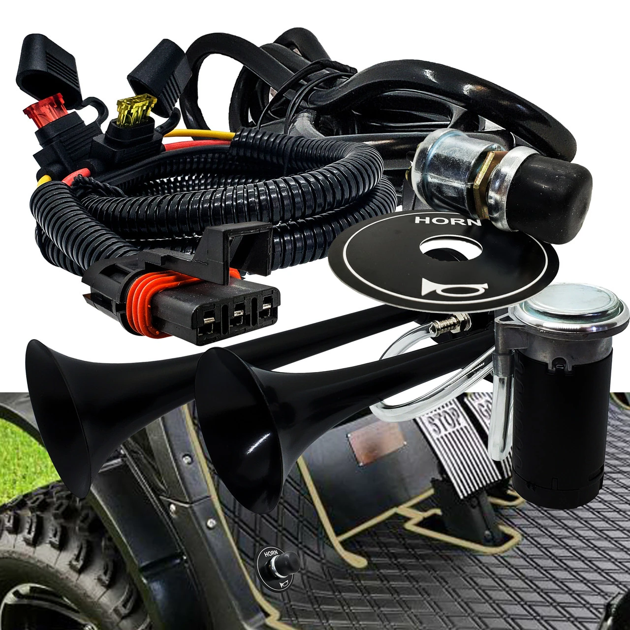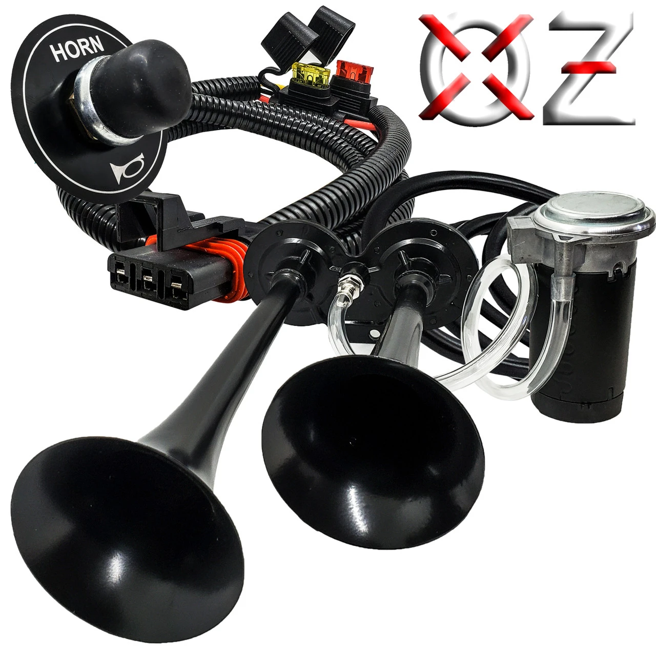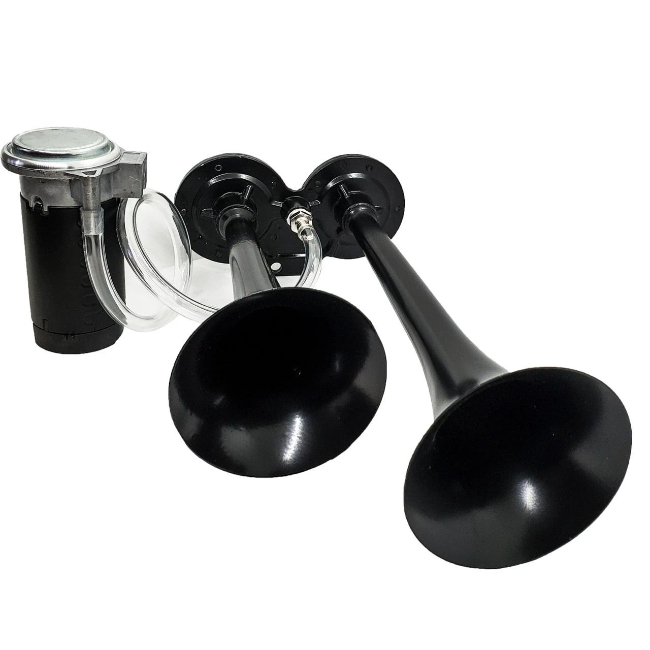 - Crafted with a heavy-duty aluminum metal base, our dual trumpet horn is engineered to endure the harshest off-road conditions. The 12-Volt direct drive compressor guarantees optimal performance, ensuring that your air horn is ready to deliver when you need it most