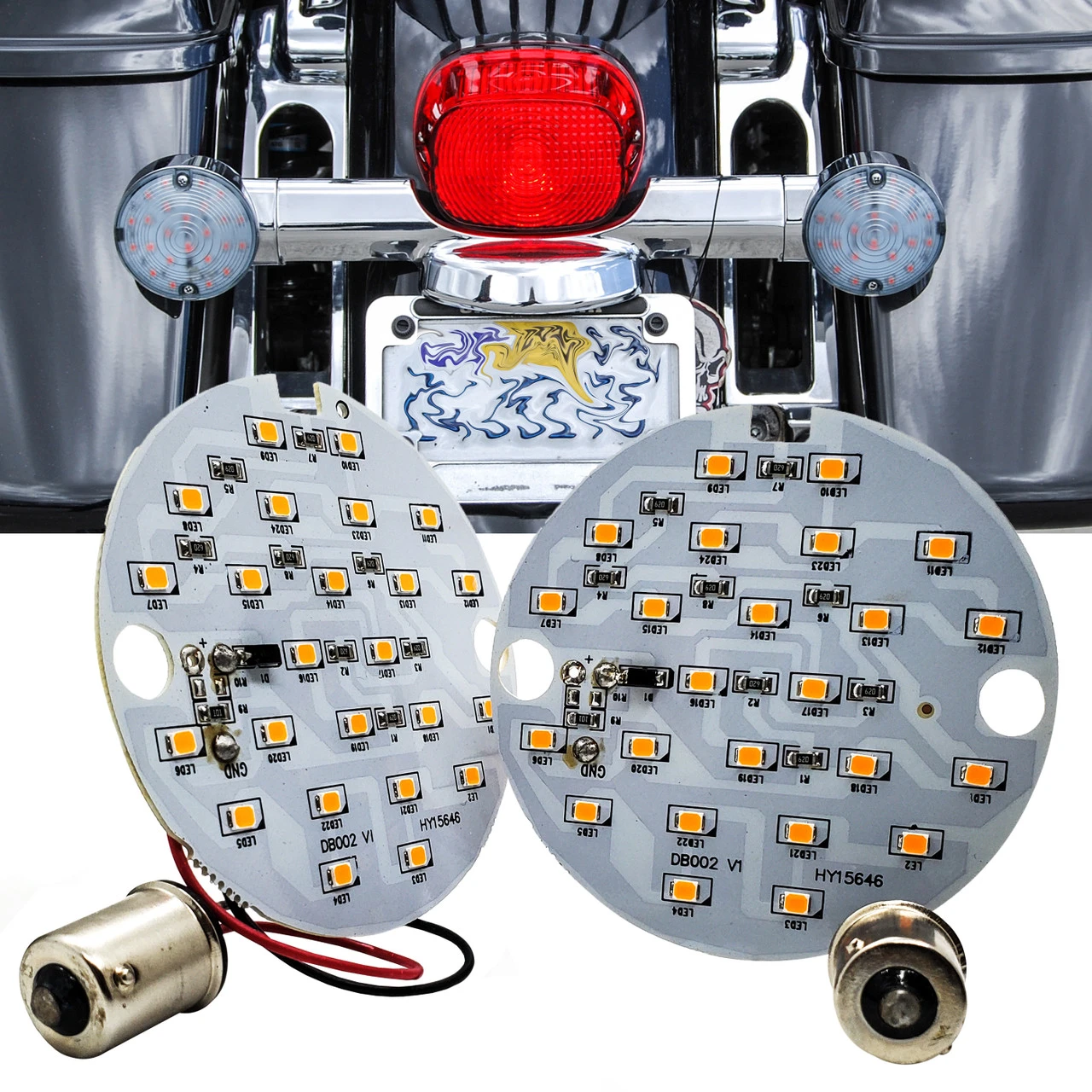 OZ-USA Brand new top quality LED turn signal boards compatible with 1986-2013 Harley. 24 LED Chip ( brightest led chip in the market) much brighter than your stock bulbs. Plug and play with easy-twist 1156 base bulb for easy installation. Our LED amber bulb insert is compatible with 1986-2013 Harley models with 2-screw lens. High-quality PCB board and high-intensity LED chip will provide better visibility to other motorists.