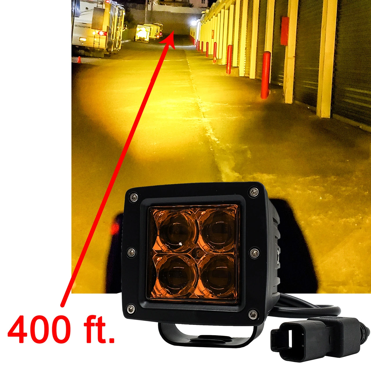 - Spot beam configuration for focused and long-range illumination. Amber light cuts through dust, fog, snow, or rain. Provides better visibility in poor driving conditions.