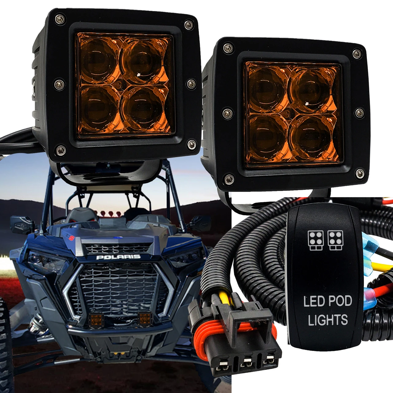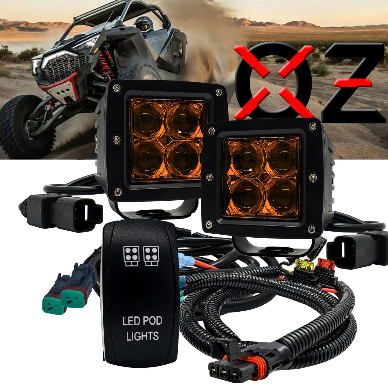 Introducing the OZ-USA 4D-Series Amber LED Pod Lights with Plug & Play power busbar wire harness kit compatible with Pulse Power Bus Bar for 2018- 2023 Polaris Ranger XP 1000 Pulse Plugs, RZR RS1/ Pro Pulse Plugs, 2019-2023 Polaris General 1000 Pulse Plugs. The 4D Amber LED pod lights offer exceptional brightness and a spot beam pattern, ensuring optimal illumination in various environments and weather conditions. This innovative kit comes complete with a power busbar wire harness, ensuring a seamless connection to your vehicle’s electrical system.