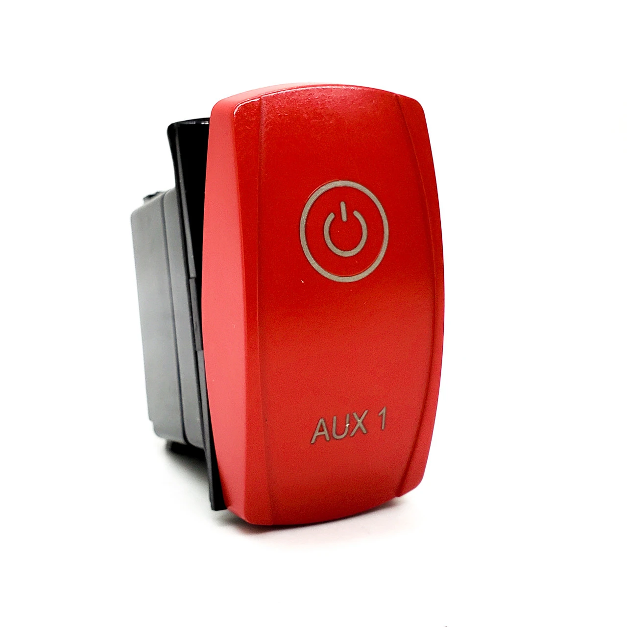 - Laser-Etched Excellence: The eye-catching laser-etched red cover plate adds a touch of sophistication to your rocker switch panel, ensuring it stands out even in low-light conditions. Elevate the aesthetics of your vehicle with the AUX 1Laser-Etched engraving.