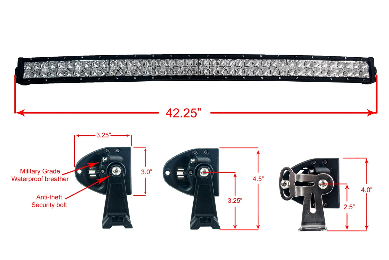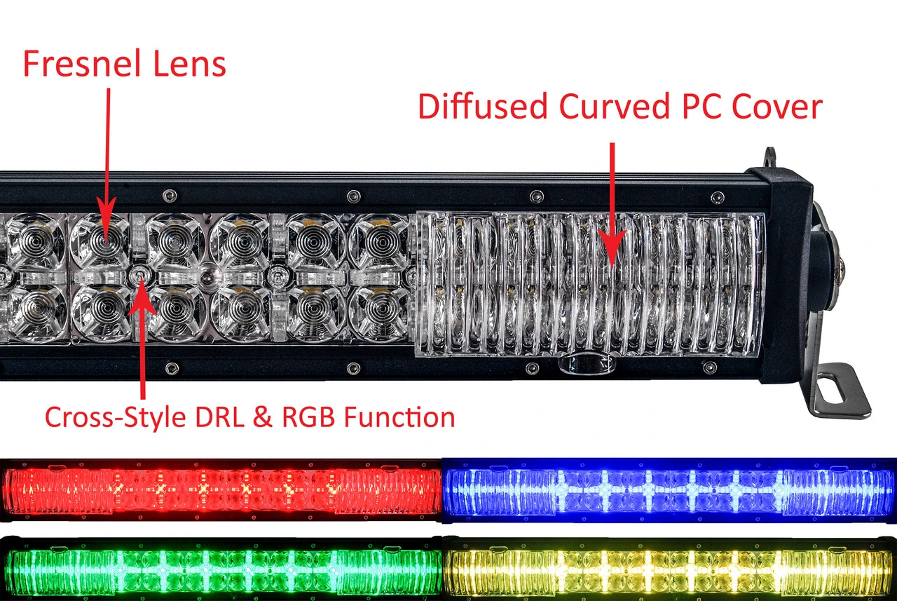 - OZ-USA® Curved 42″ 240W Fresnel Lens Double Row Dimmable LED light bar with cross style DRL & RGB Functions. Combo Beam (Spot+Flood)