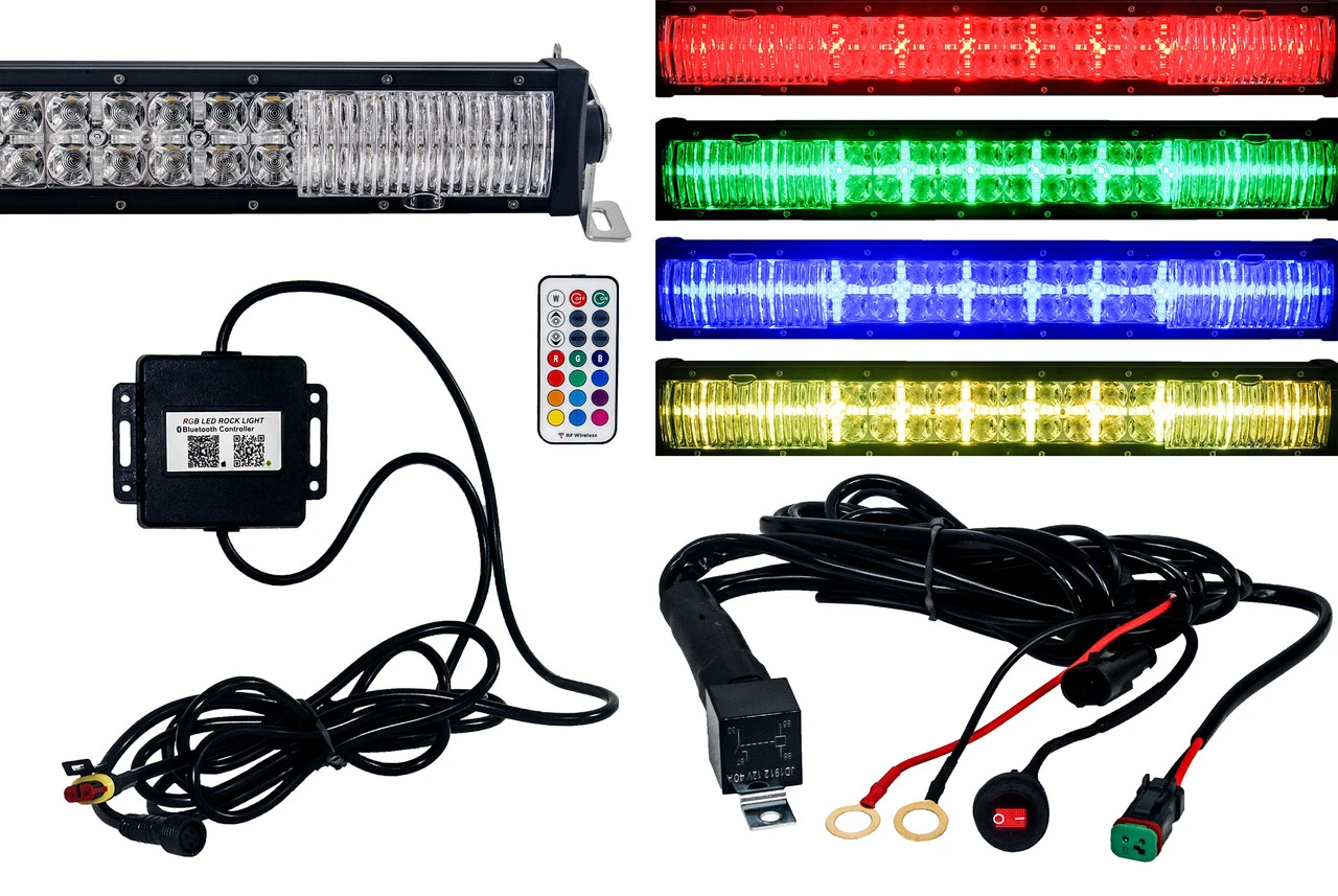 - Harness, Mounting Brackets, RGB remote, security hardware and 2 curved diffused clear over. Also available in Black and Amber. Sold Separately.