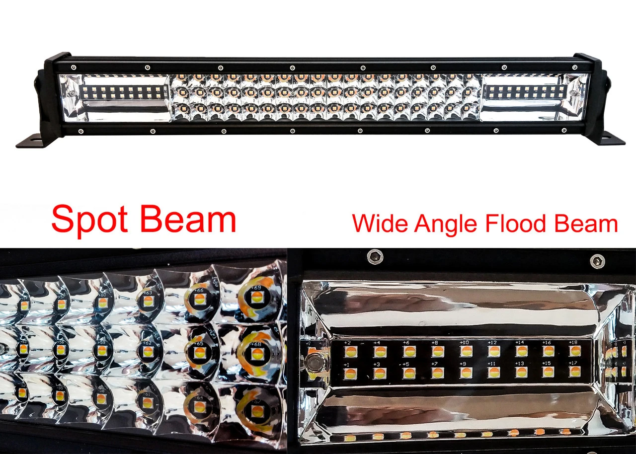 - Triple Row Design. Combo Beam. Spot beam and Wide angle flood beam.