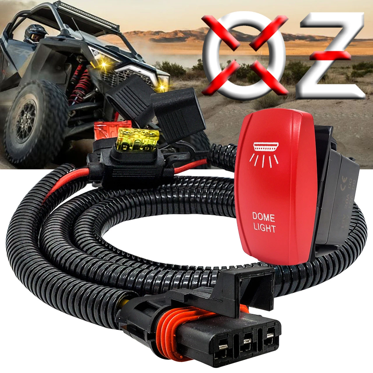 OZ-USA Plug and play power bus bar plug wire kit with On/Off Red Rocker Switch for DOME LIGHTS compatible with Pulse Busbar 2018 – 2023 Polaris Ranger XP 1000 Pulse Plugs, RZR RS1/ Pro Pulse Plugs, 2019-2023 Polaris General 1000 Pulse Plugs. 3.5ft. AWG #14 wire with pre-installed plugs for use with the 4-Pin rocker switch. Our wire harness connects directly to your Polaris Pulse power busbar and includes a red rocker switch and a pulse plug. Everything is prewired and ready to install. Simply plug in your DOME LIGHT wire to the back of the rocker switch.