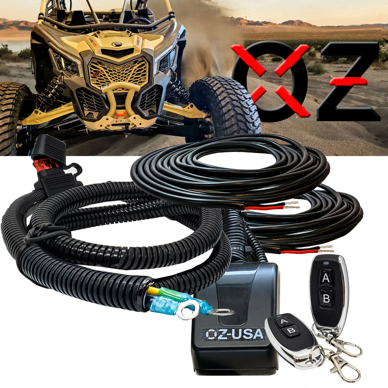 Great for wiring LED lights, light bars, pod lights, rear lights, radio, air compressor, rock lights, or any auxiliary accessory. Compatible with 2018-2023 Can-Am Maverick X3 RS Turbo, Commander XT 1000R, Defender, and Defender 6x6. Remote operating distance: Up to 165ft (50 meters) Remote frequency: 433MHz Remote switches are programmed as toggle switches. A controls Aux A, and B controls Aux B. Press once to turn on, press the same button again to turn off. OZ-USA® Difference: -