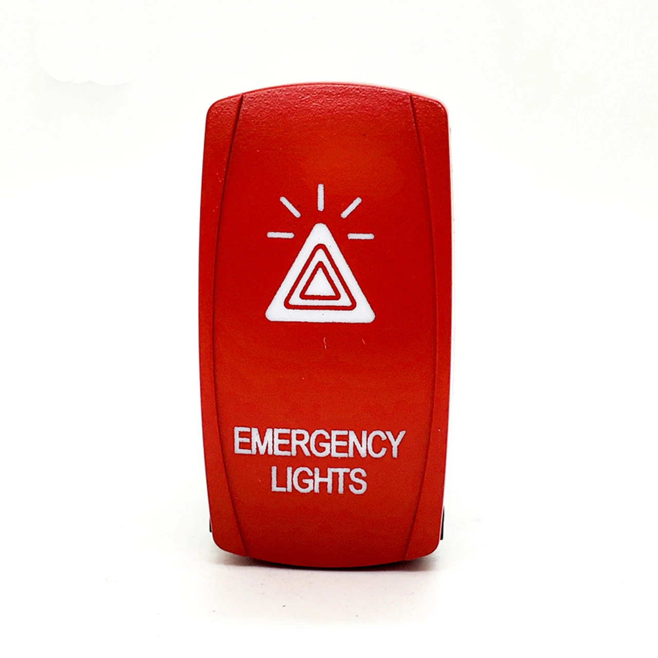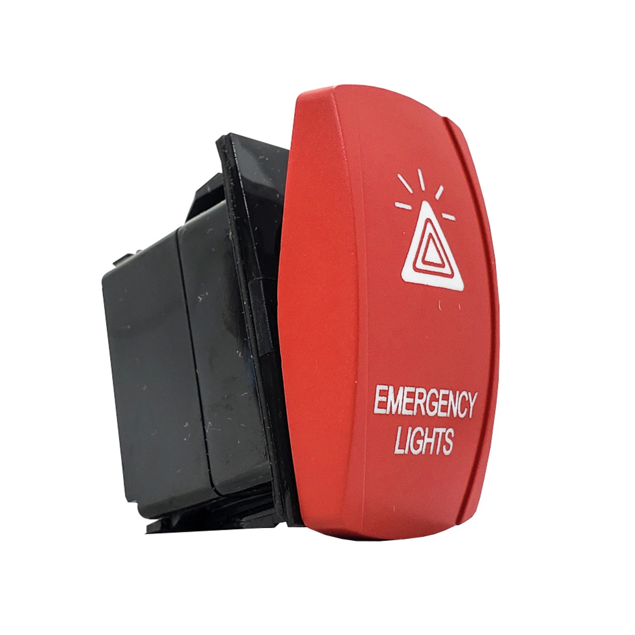 OZ-USA Emergency Light On/Off 4-Pin Rocker Switch with a Laser Etch symbol and a vibrant red plate. The perfect rocker switch for all your off-road adventures and vehicle customization needs. This versatile switch is designed to deliver exceptional performance and reliability in a wide range of applications, including off-road vehicles, UTVs, trucks, RVs, side-by-sides, marine vessels, boats, marine vessels, and heavy equipment vehicles. The eye-catching laser-etched red cover plate will stand out on your rocker switch panel even in low-light conditions.