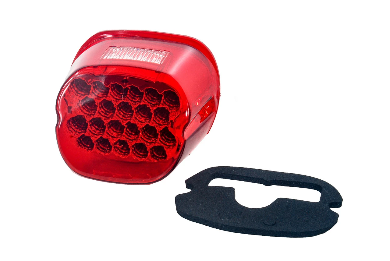 Brand new, LED tail/brake light with red lens for your Harley. Best design in the market. It has ultra bright Red LEDs for maximum visibility + and 4 white LEDs for the license plate. This tail light lens will add a customized feature to your Harley. The high-intensity LED will provide greater visibility and it will consume substantially less power compared to standard halogen lights (great for loaded touring). Lay down style, which is angled to follow the curve of your OEM fender for a customized look.