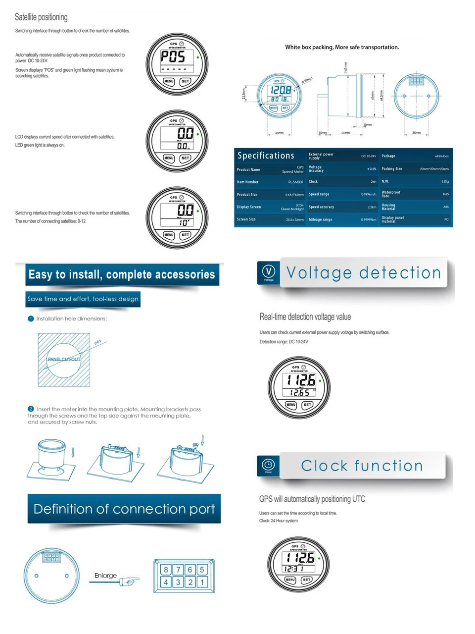 - Re-settable trip meter. Accurate GPS satellite positioning to measure and display current speed up to 999 MPH.