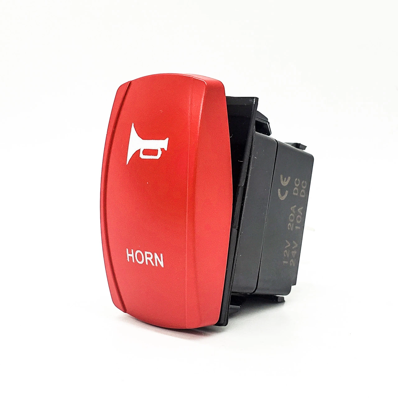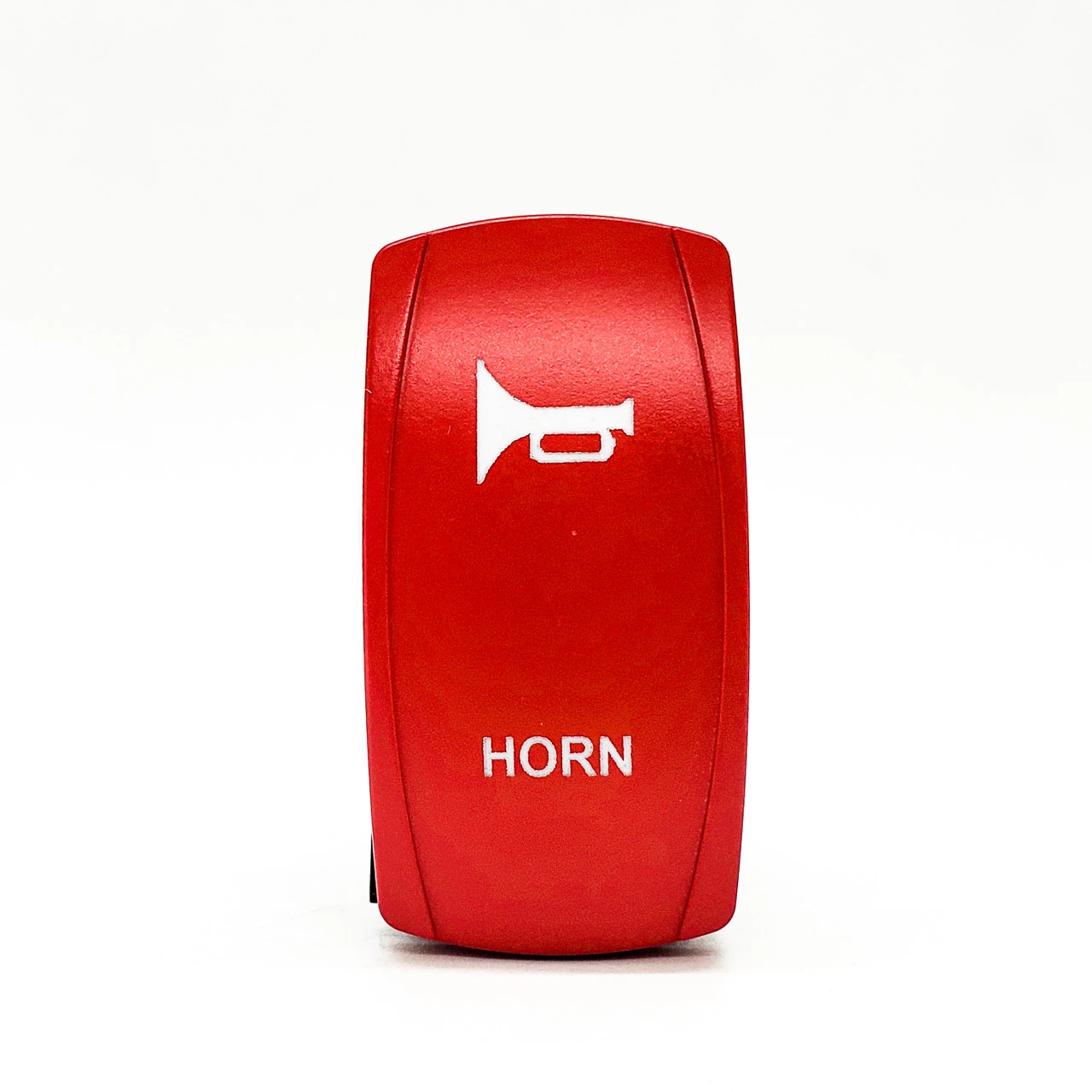 OZ-USA Horn momentary On/Off 4-Pin Rocker Switch with a Laser Etch symbol and a vibrant red plate. The perfect rocker switch for all your off-road adventures and vehicle customization needs. This versatile switch is designed to deliver exceptional performance and reliability in a wide range of applications, including off-road vehicles, UTVs, trucks, RVs, side-by-sides, marine vessels, boats, golf carts, and heavy equipment vehicles. The eye-catching laser-etched red cover plate will stand out on your rocker switch panel even in low-light conditions.