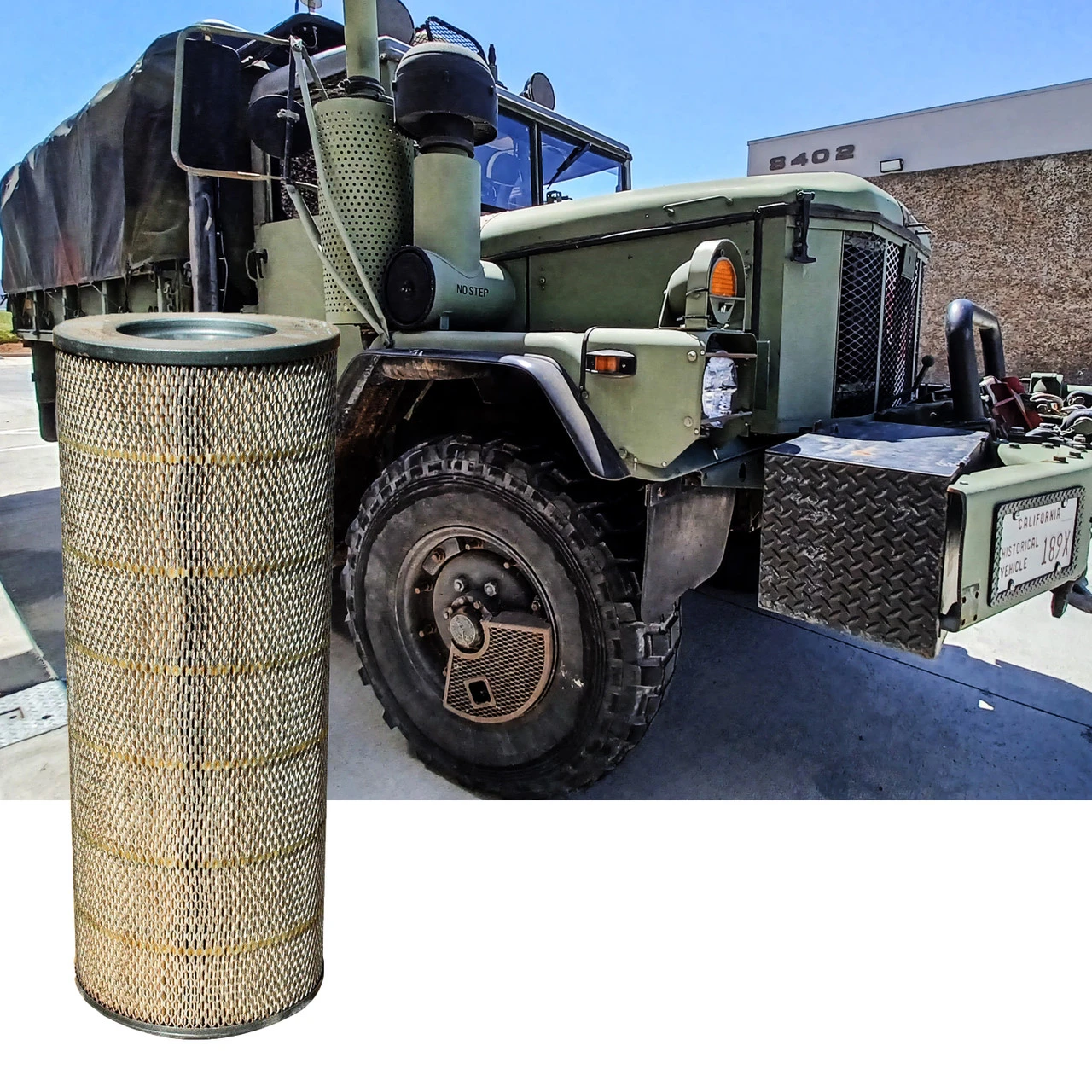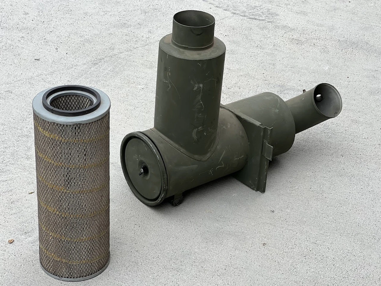 Includes a very clean, used, original government issue air filter element intake for M35A3 2.5 Ton 6X6 military truck with a CAT 3116 diesel engine. Washable.