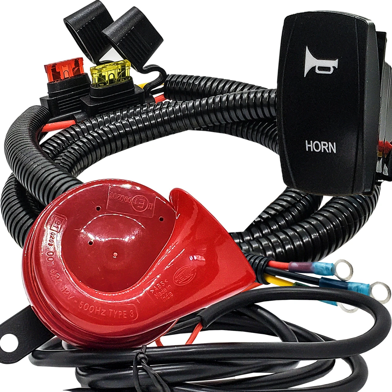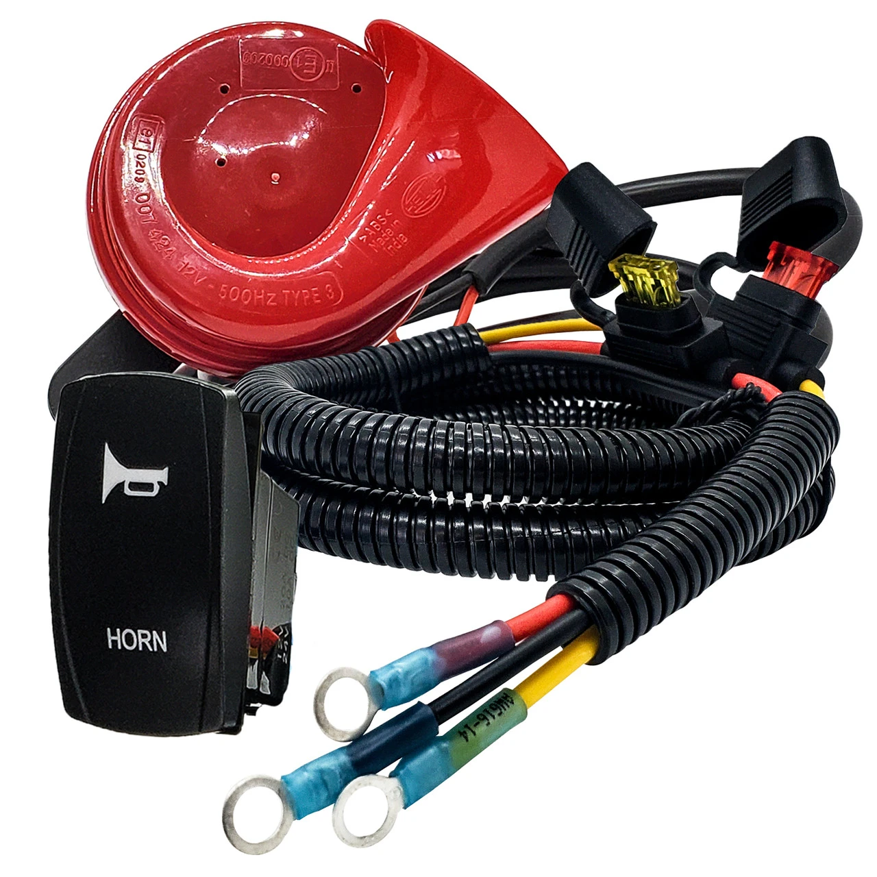 The complete horn kit includes everything you need to make a statement off-road. It features a momentary horn on/off rocker switch for easy control and operation. A durable 5ft tin-coated copper AWG #14 wire connects the trumpet horn directly to the rocker switch, ensuring a reliable and secure connection.