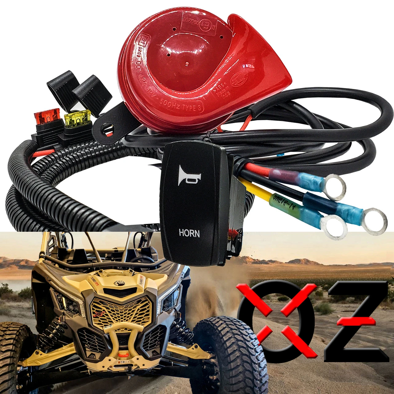 Unleash the power of the OZ-USA Off-Road Traffic Blaster! This impressive plug and play Hella Trumpet Horn with a power bus bar distribution block wire harness kit is designed specifically for use with 2018-2023 Can-Am Maverick X3 Max RS Turbo RR, Sport, Trail, Commander, and Defender models.
