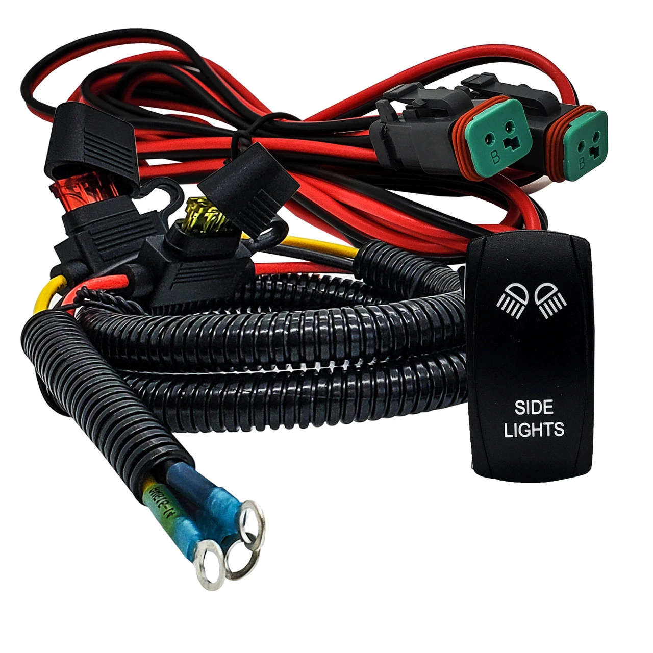 OZ-USA Plug and play double DT Deutsch plug factory power bus bar distribution block wire harness kit for LED side lights compatible with Can-Am Maverick X3 Max RS Turbo RR, Sport, Trail, and Defender. It can be installed in minutes and is pre-wired for 2 LED lights with an in-dash rocker switch. The side lights harness is designed for use with lower amperage LED lights for up to 240 Watts. The side light harness includes a 10ft split wire with Deutsch plug connectors for a waterproof connection. This wiring harness will make it easier to add accessory lights to your side-by-side.