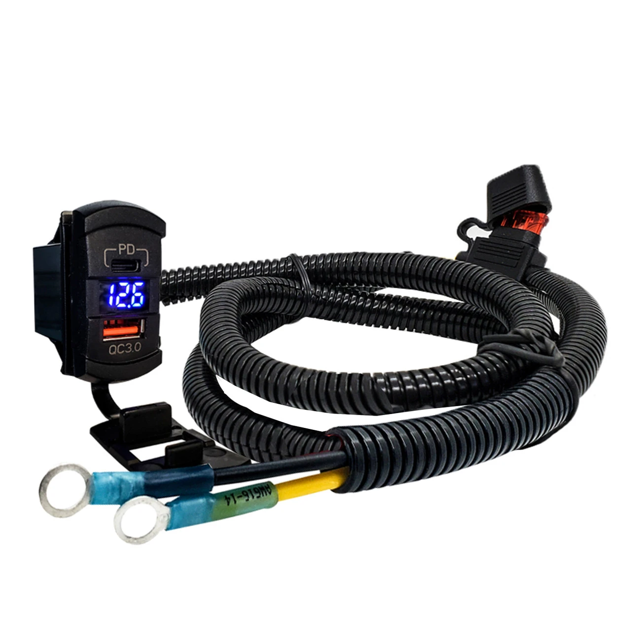 - 6ft. 14AWG wire with a 10A fuse. Wires are protected with split wire loom tubing.