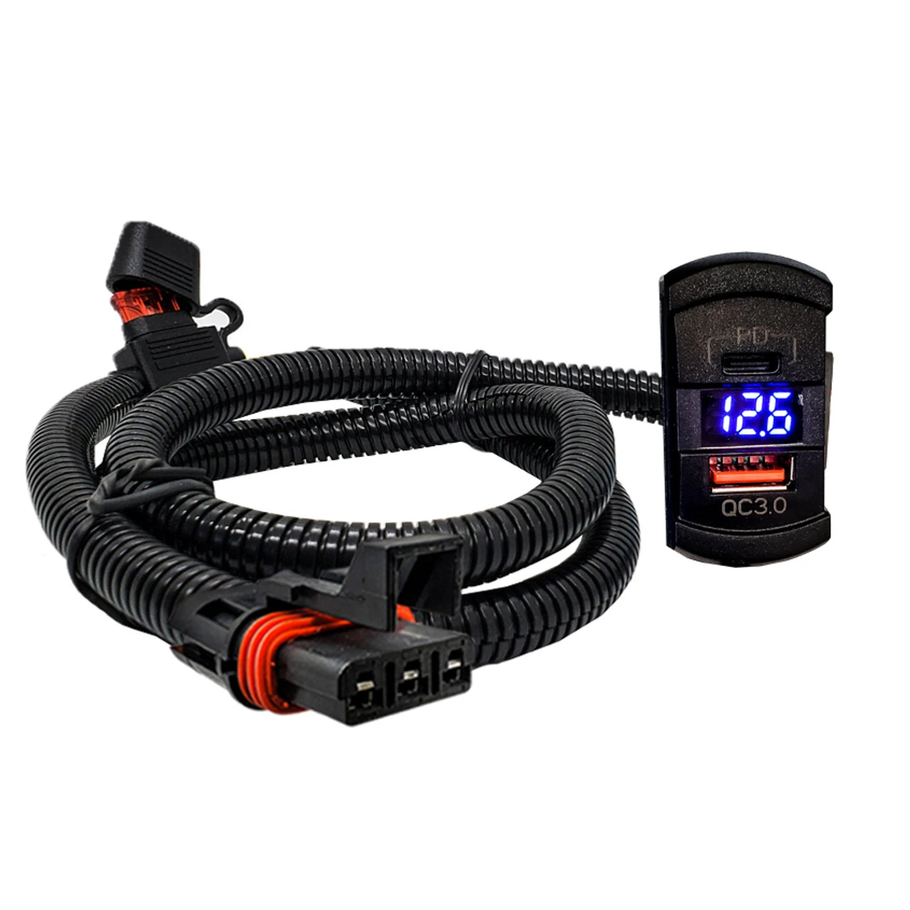 OZ-USA Plug and play power bus bar wire harness USB charging port Quick Charge 3.0 and USB-C Power Delivery (PD) with digital display voltage meter compatible with Pulse Power busbar for 2018- 2023 Polaris Ranger XP 1000 Pulse Plugs, RZR RS1/ Pro Pulse Plugs, 2019-2023 Polaris General 1000 Pulse Plugs.