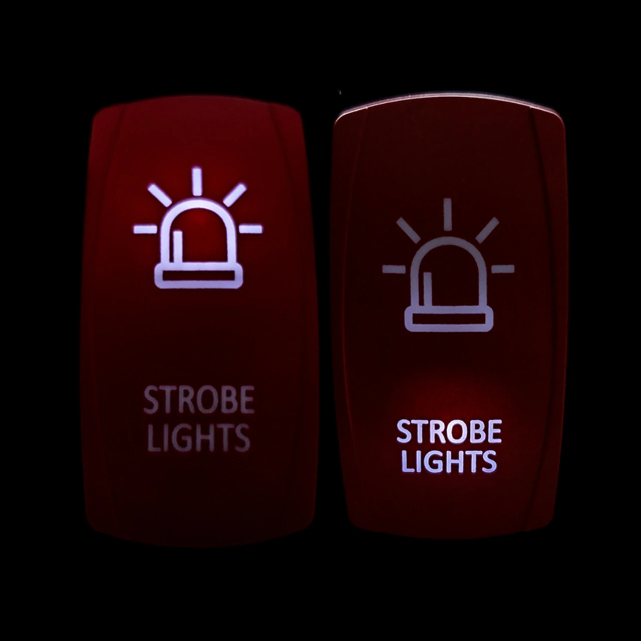 - Strobe lights laser-etched symbol and vibrant red plate ON/OFF Rocker switch is included. White LED backlit. 20 Amp 12-Volt 4-PIN SPST.