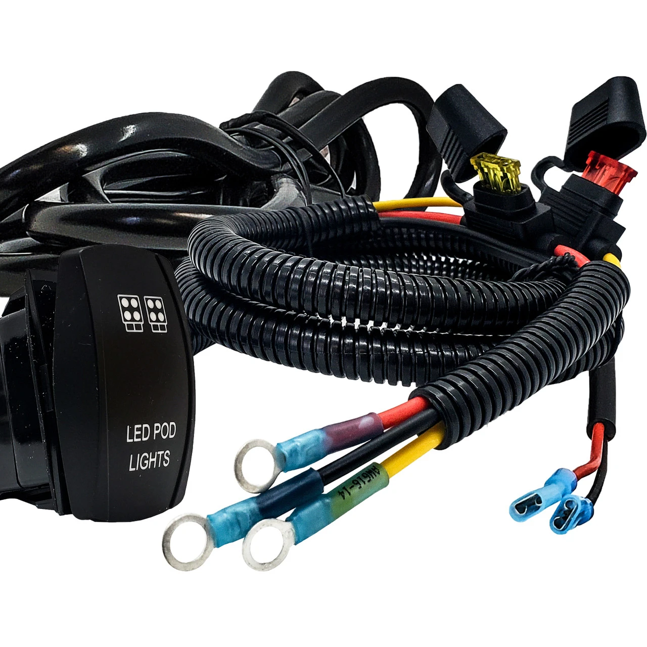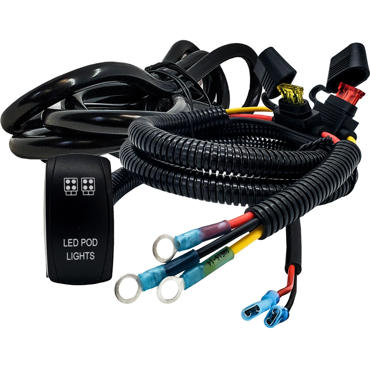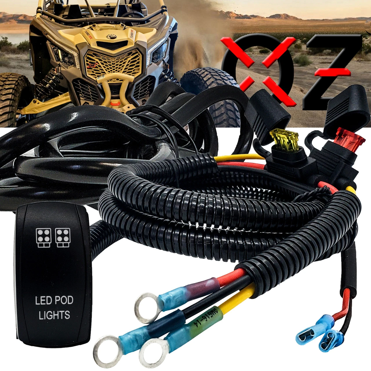 OZ-USA Plug and play power busbar distribution block wire with On/Off rocker switch for LED pod lights compatible with Can-Am Maverick X3 Max RS Turbo RR, Sport, Trail, and Defender. 6ft. AWG #14 wire harness with pre-installed power distribution block terminal rings and On/Off rocker switch compatible with in-dash rocker switch panel. Built-in fuse holders for both the ignition wire and constant power wire. A 10ft tin-coated copper wire is also included to connect to your Pod lights. This accessory wire harness will make it easier to add LED POD lights. Simply combine your 2 LED POD lights wire and connect to the wire harness. The switch relay can handle up to 240 Watts of LED lights.