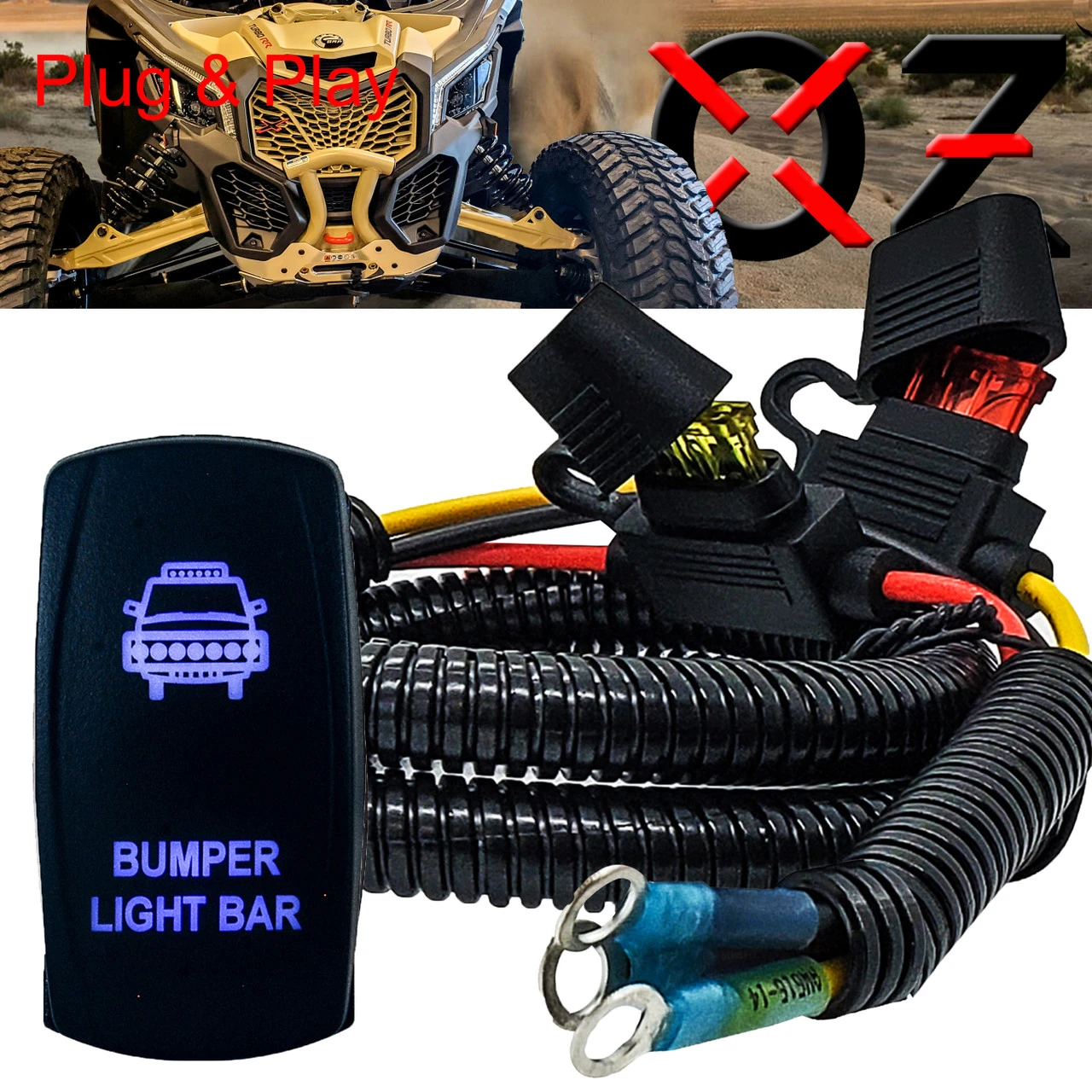 The OZ-USA Plug and Play Power Busbar Distribution Block Wire is a simple and convenient wiring solution designed for Can-Am Maverick X3 Max RS Turbo RR, Sport, Trail, and Defender models. It features a 6-foot wire harness with a 14AWG gauge, pre-installed power distribution block terminal rings, and an On/Off rocker switch compatible with the in-dash rocker switch panel. With built-in fuse holders for both the ignition wire and constant power wire, this wire harness ensures safety and protection. It simplifies the process of adding LED bumper lights by allowing you to plug the LED bumper light wire into the back of the rocker switch. The rocker switch relay can handle up to 240 Watt LED lights, providing ample power for your lighting needs.