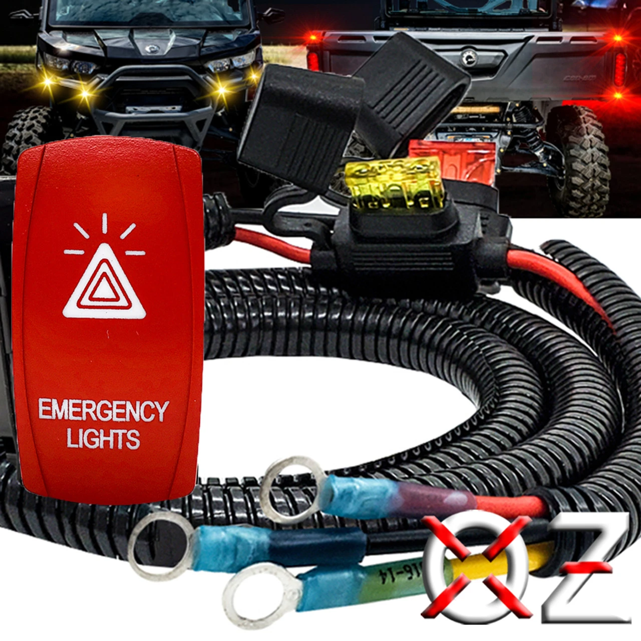 OZ-USA Plug and play power busbar distribution block wire with Emergency lights On/Off red rocker switch compatible with Can-Am Maverick X3 Max RS Turbo RR, Sport, Trail, and Defender. 6′ AWG #14 wire harness with pre-installed power distribution block terminal rings and On/Off rocker switch compatible with in-dash rocker switch panel. Built-in fuse holders for both the ignition wire and constant power wire. This accessory wire harness will make it easier to add LED lights. Simply plug in the emergency light wire to the back of the rocker switch. The rocker switch relay can handle up to 240 Watt LED lights.