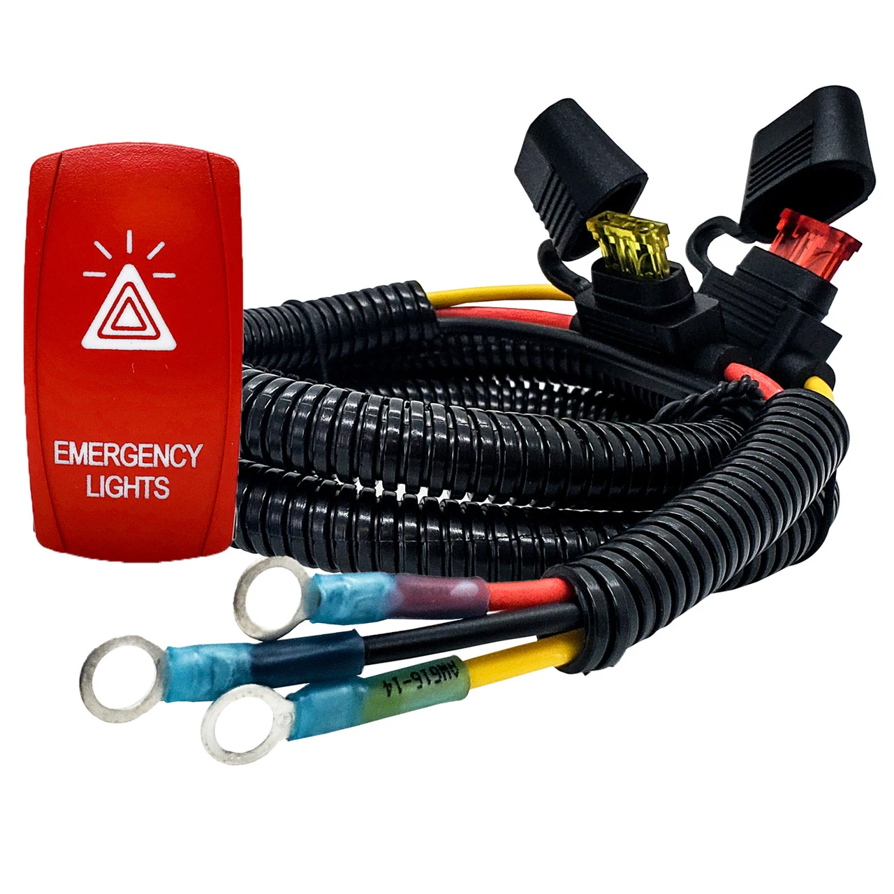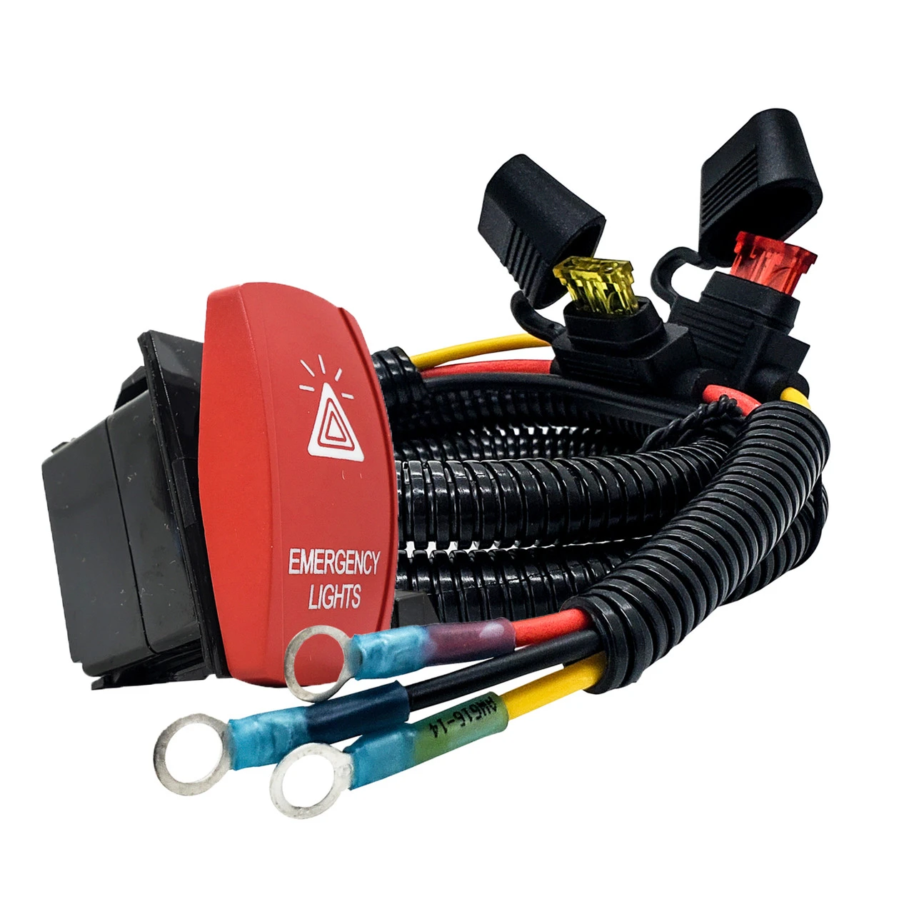 - Emergency Light laser-etched symbol with vibrant red plate ON/OFF Rocker switch is included. White LED backlit. 20 Amp 12-Volt 4-PIN